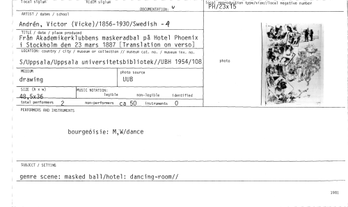 //// 1 ocal siglum RIdIM siglum //// DOCUMENTATION: V //// local /23xrep15 //// roduction type/size//local negative number //// PH //// ARTIST / dates / school //// Andr61, Victor (Vicke)/1856-1930/Swedish -4 //// TITLE / date / place produced //// Från Akademikerklubbens maskeradbal på Hotel Phoenix i Stockholm den 23 mars 1887 [Translation on verso] //// LOCATION: country / city / museum or collection // museum cat. no. / museum inv. no. //// S/Uppsala/Uppsala universitetsbibliotek//UBH 1954/108 //// MEDIUM photo source //// drawing UUB //// SIZE (h x w) MUSIC NOTATION: identified //// 48,5x36 legible non-legible //// total performers 2 non-performers ca 50 instruments 0 //// PERFORMERS AND INSTRUMENTS //// photo //// bourgeoisie: KW/dance //// SUBJECT / SETTING //// genre scene: masked ball/hotel: dancing-room// //// 1981 ////