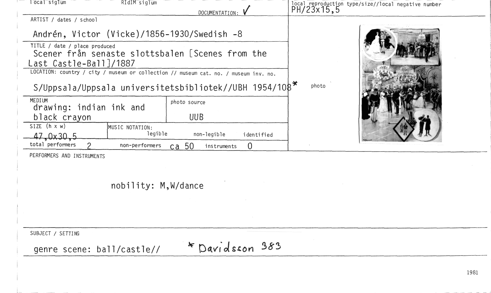 //// I oca 1 si gTum RldIM si gl um //// DOCUMENTATION • if //// 1 ocal reproducti on type/s i ze//1 ocal negative nutuber //// PH/23x15,5 //// ARTIST / dates / school //// Andr61, Victor (Vicke)/1856-1930/Swedish -8 //// TITLE / date / place produced //// Scener från senaste slottsbalen [Scenes from the Last Castle-Ball]/1887 //// LOCATION: country / city / museum or collection // museum cat. no. / museum i nv . no. //// S/Uppsala/Uppsala universitetsbibliotek//UBH 1954/108* //// MEDIUM //// drawing: indian ink and black crayon //// MUSIC NOTATION: //// legible non-1 egi bl e i denti fi ed //// non-performers ca 50 instruments 0 //// S ZE (h x w) //// 47,0x30,5 //// total performers 2 //// photo source //// UUB //// photo //// PERFORMERS AND INSTRUMENTS //// nobility: M,W/dance //// SUBJECT / SETTING //// genre scene: ball/castle// k- D avi d s.con 585 //// 1981 ////