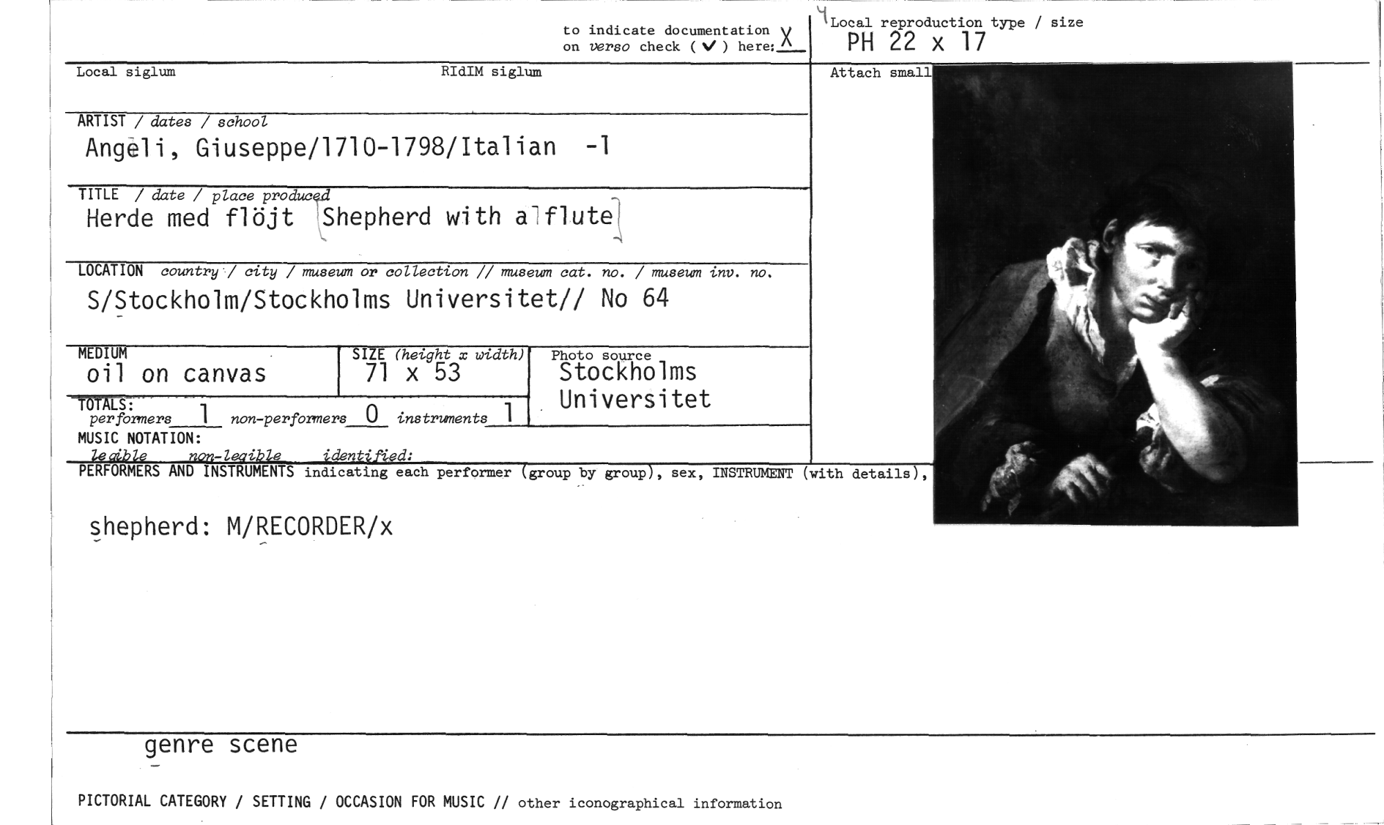 //// to indicate docunientation V on versa check (NI ) here:2_ //// LILocal reproduction type / size //// PH 22 x 17 //// Local siglum RIdIM siglum //// ARTIST / dates / school //// Angeli, Giuseppe/1710-1798/Italian -1 //// TITLE / date / place produc92 //// Herde med flöjt Shepherd with alflute //// LOCATION country / city / museum or collection // museum cat. no. / museum inv. no. //// S/Stockholm/Stockholms Universitet// No 64 //// MEDIUM //// oil on canvas //// SIZE (height x width) //// 71 x 53 //// TVÅLS: //// per formers 1 non-perfbrmers 0 instruments 1 //// MUSIC NOTATION: //// Uosc°0-11ms Universitet //// -Z " 'den d: //// PERFORMERS AND INSTRUMENTS indicating each performer group by group , sex, INSTRUMENT (with details), //// shepherd: M/RECORDER/x //// genre scene //// PICTORIAL CATEGORY / SETTING / OCCASION FOR MUSIC // other iconographical information ////