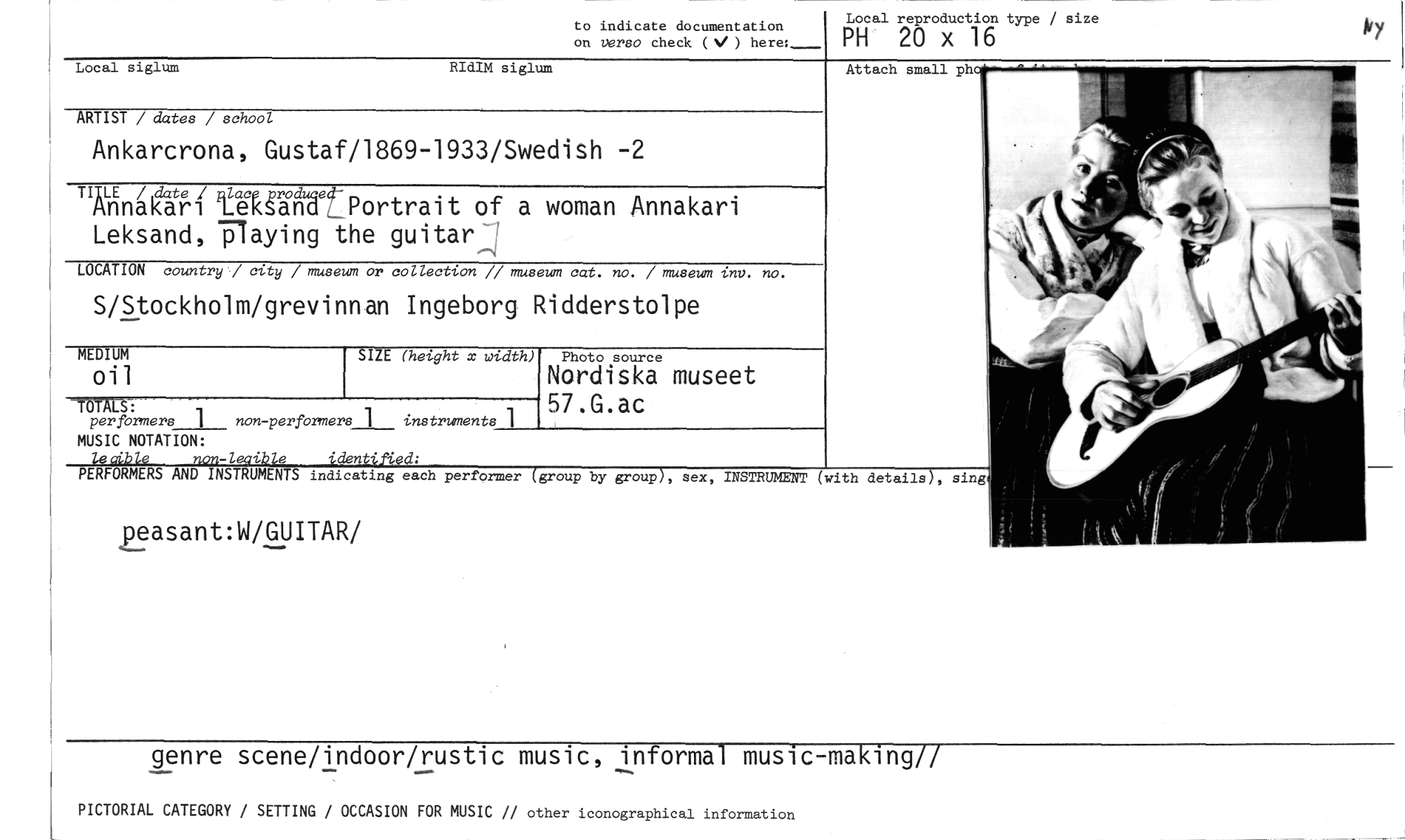 //// ay //// Local siglum RIdIM siglum //// to indicate documentation //// on verso check ( V ) here:_ //// Local reproduction type / size //// PH 20 x 16 //// Attach small ph //// ARTIST / dates / school //// Ankarcrona, Gustaf/1869-1933/Swedish -2 //// "nkrinåkzaati-itekgrände4:-. Portrait of a woman Annakari Leksand, Tlaying the guitar-J //// LOCATION country / city / museum or collection // museum cat. no. / museum inv. no. //// S/Stockholm/grevinnan Ingeborg Ridderstolpe //// MEDIUM //// oil //// SIZE (height x width) //// Photo source //// Nordiska museet 57.G.ac //// TÖTALS : //// per formers 1 non-performers 1 instruments 1 //// MUSIC NOTATION: //// Zocrib/e non-leaible identijied: //// PERFORMERS AND INSTRUMENTS indicating each performer (group by group), sex, INSTRUMENT (with details), sing //// peasant:W/GUITAR/ //// genre scene/indoor/rustic music, informal music-making// //// PICTORIAL CATEGORY / SETTING / OCCASION FOR MUSIC // other iconographical information ////