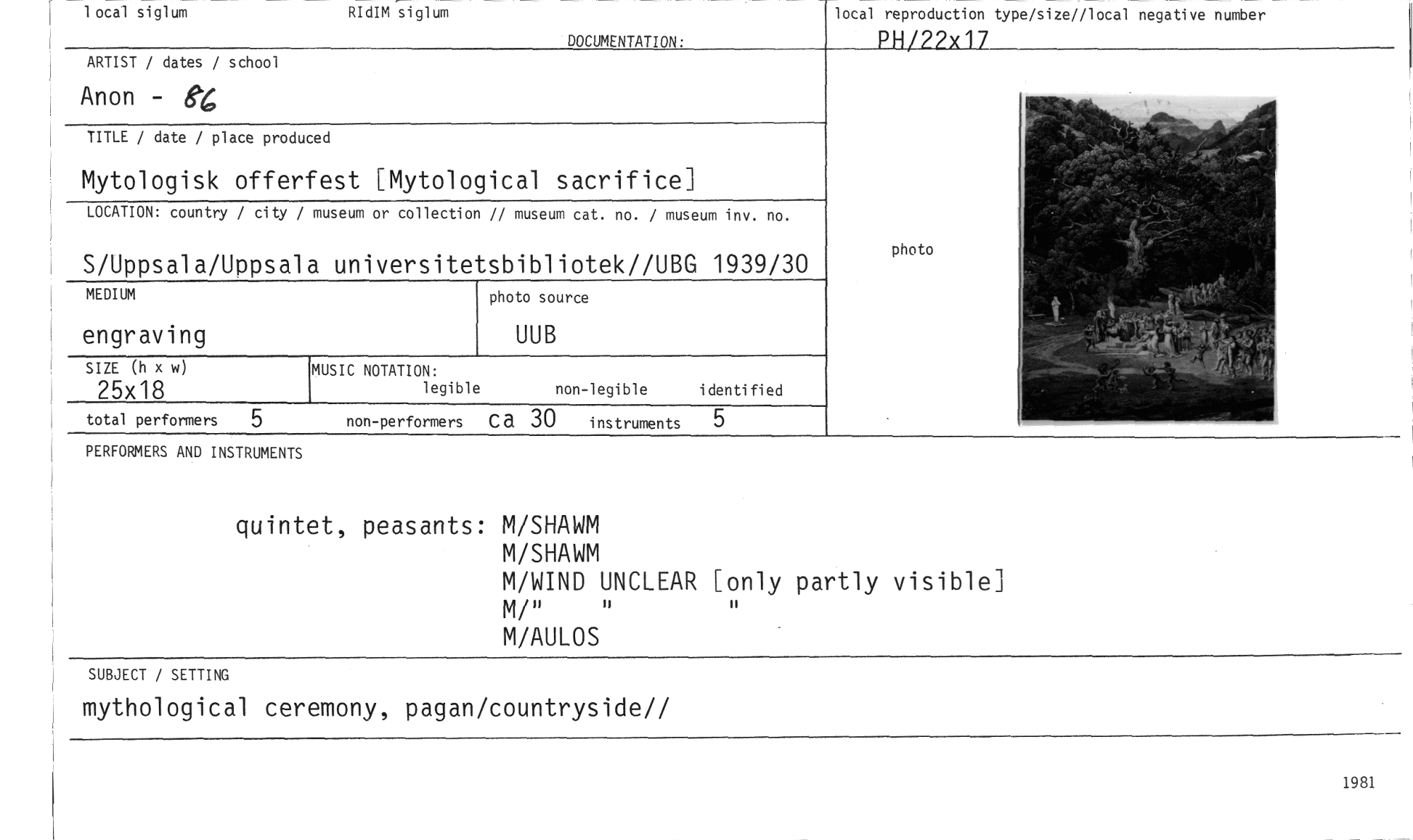 //// 1 ocal siglum RIdIMdgluM1- //// DOCUMENTATION • //// local reproduction type/size//local negative number //// PH/?2x17 //// ARTIST / dates / school //// Anon - ec //// TITLE / date / place produced //// Mytologisk offerfest [Mytological sacrifice] //// LOCATION: country / city / museum or collection // museum cat. no. / museum inv. no. //// S/Uppsala/Uppsala universitetsbibliotek//UBG 1939/30 //// MEDIUM //// engraving //// MUSIC NOTATION: //// legible non-legible identified //// total performers 5 non-performers Ca 30 instruments 5 //// SIZE (h x w) //// 25x18 //// photo source //// UUB //// photo //// PERFORMERS AND INSTRUMENTS //// quintet, peasants: M/SHAWM M/SHAWM M/WIND UNCLEAR [only partly visible] //// Mr //// M/AULOS //// SUBJECT / SETTING //// mythological ceremony, pagan/countryside// //// 1981 ////