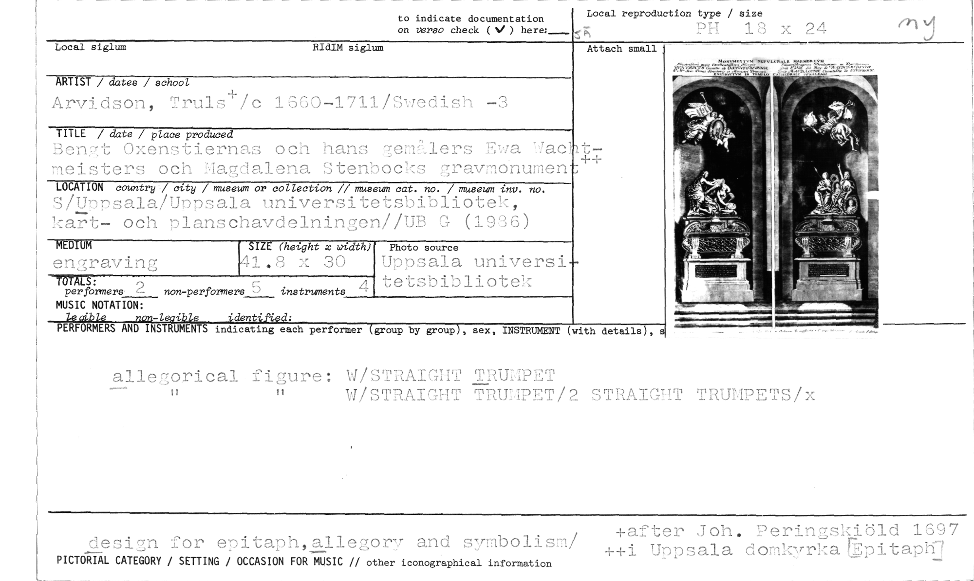 //// to indicate documentation on verso check (V) //// Local reproduction type / size //// t.6 -DH //// 24 //// Attach small //// ARTIST / dater / school //// Arvidson, Truls+/c 1660-1711/S redic.i //// TITLE / date / place produced //// Bengt Oxenstiernas och hans gerillers Ewa Yacht- //// meisters och Magdalena Stenbocks gravmonumerru++ //// LOCATION country". city / museum or collection // museum cat. no. / museum inv. no. //// S/Unpsala/Unnsala universitetsbibliotek, kart- och planschavdelningen//UB G (1986) //// MEDIUM SIZE (height x tovdth) //// engraving 41.8 x 30 //// -MWS: //// perfbrmers 2 non-perförmers ,D instruments 4 //// MUSIC NOTATION: //// non-legible identified: //// PER ORMERS AND INSTRUMENTS indicating each performer (group by group), sex, INSTRUMENT (with details), //// Local siglum RIdIM siglum //// Photo source //// Uppsala universitetsbibliotek //// allegorical figure: W/STRAIGHT TRUMPET //// W/STRAIGHT TRUMPET/2 STRAIGHT TRUMPETS/x //// design for epitaph,alleP.ory and symbolism/ +after Joh. Peringskiöld 1697 ++i Uppsala domkyrkarkpitaph7 //// PICTORIAL CATEGORY / SETTING / OCCASION FOR MUSIC // other iconographical information ////