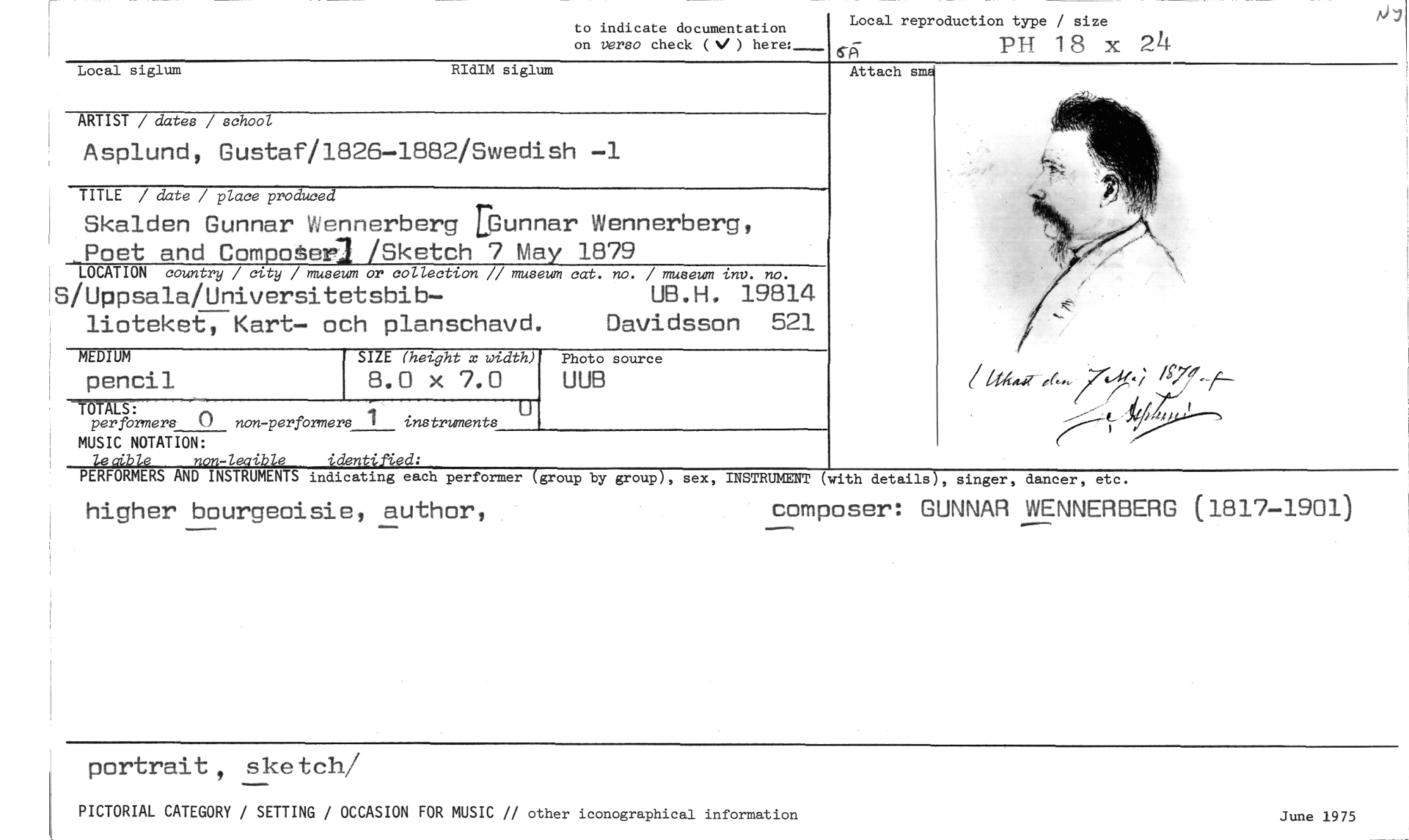 //// to indicate documentation //// on verso check (V ) here: _--- //// Local reproduction type / size //// 6-P7 PH 1 R X 24- //// Attach små //// Local siglum RUSA siglum //// ARTIST / dates / school //// Asplund, Gustaf/1826-1882/Swedish —1 //// TITLE / date / place produced //// Skalden Gunnar Wennerberg EGunnar Wennerberg, //// Poet and Compoåea /Sketch 7 May 1879 //// LOCATION country / city / museum or collection // museum cat. no. / museum inv. no. //// S/Uppsala/Universitetsbib— UB.H. 19814 //// lioteket, Kart— och planschavd. Davidsson 521 //// SIZE (hel.ght x width) //// 8.0 x 7.0 //// -TUM: //// per formers 0 non-performers 1 instruments //// I MUSIC NOTATION: //// locible non-leaible identified: //// PERFORMERS AND INSTRUMENTS indicating each performer (group by group), sex, INSTRUMENT (with detailsY, singer, dancer, etc. //// higher bourgeoisie, author, composer: GUNNAR WENNERBERG (1817-1901) //// MEDIUM //// pencil //// Photo source //// UUB //// GrAd47- ,6— ..14; //// portrait, sketch/ //// PICTORIAL CATEGORY / SETTING / OCCASION FOR MUSIC // other iconographical information June 1975 ////