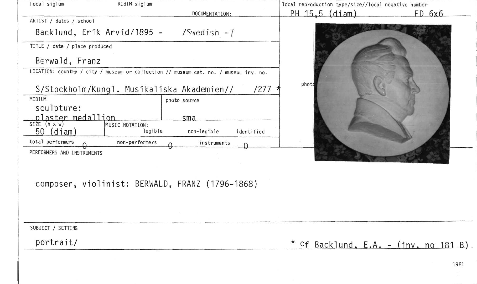 //// lotal siglum RIdIM siglum //// DOCUMENTATION: //// lotal reproduction type/sim//local negative number //// PH 15,5 (diam) Fn 6x6 //// ARTIST / dates / school //// Backlund, Er-ik Arvid/1895 - /SiNiedit;i -j //// TITLE / date / place produced //// Berwald, Franz //// LOCATION: country / city / museum or collection // museum cat. no. / museum inv. no. //// Sma //// MUSIC NOTATION: //// legible non-legible identified //// total performers non-performers instruments //// PERFORMERS AND INSTRUMENTS //// MEDIUM //// sculpture: //// plaC..pr mpdallion //// SIZE (h x w) //// 50 (diam) //// phot //// S/Stockholm/Kungl. Musikaliska Akademien// /277 * //// photo source //// composer, violinist: BERWALD, FRANZ (1796-1868) //// SUBJECT / SETTING //// portrait/ * Cf Backlund, E.A. - //// 1981 //// PERFORMERS AND INSTRUMENTS //// 2 peasants M/LUTE //// M/VIOLIN //// SUBJECT / SETTING //// rural scene - domestic music/tavern +after Molenaer //// 1981 //// SIZE (h x w //// MUSIC NOTATION, //// legible //// non-legible identified //// total performers 2 //// non-performers 4 instruments //// local reproduction type/size//local negative number //// PH 18 x 15 //// DOCUMENTATION: //// ARTIST / dates / school //// Baillie, Williaffif/1723-1810/English - //// TITLE / date / place produced //// Det glada bondsällskapet //// LOCATION: country / city / museum or collection // museum cat. no. / museum inv no. //// ' S/Stockholm/Nationalmuseum// NM G s.n. //// MEDIUM //// print/ //// —411. //// wi //// Vi I //// (1111.111!!: //// photo source //// NM D 49.013 //// RIdIM siglum //// 1 ocal siglum //// photo ////