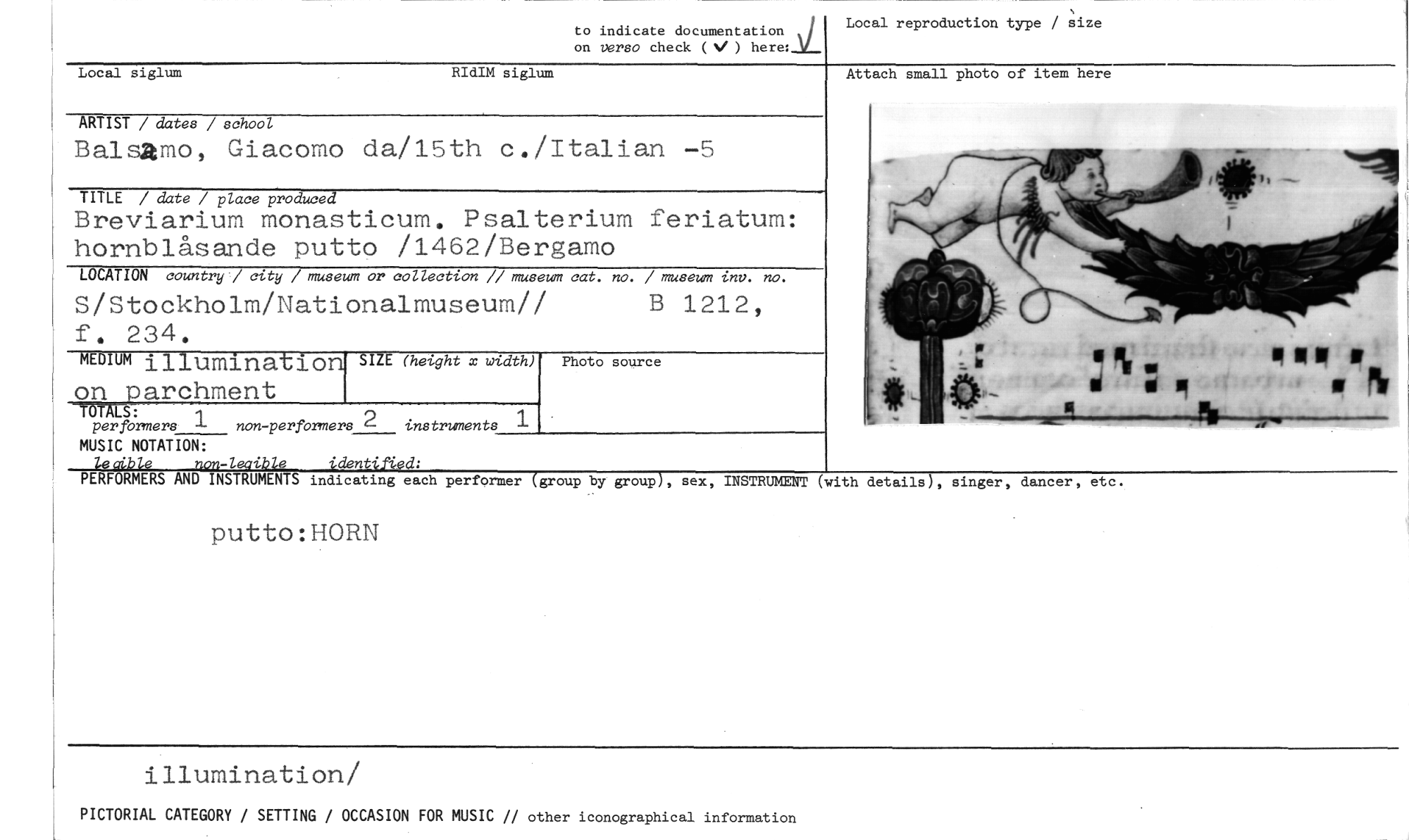 //// to indicate documentation I on versa check (V) here: //// Local reproduction type / size //// Local siglum RIdIM siglum //// ARTIST / dates / school //// Balaamo, Giacomo da/15th c./Italian -5 //// TITLE / date / place produced //// Breviarium monasticum. Psalterium feriatum: hornblåsande putto /1462/Bergamo //// LOCATION countryi/ city / museum or collection // museum cat. no. / museum inv. no. //// S/Stockholm/Nationalmuseum// B 1212, //// f. 234. //// MEDIUM illumination //// on parchment //// -TUTAM i 2 • //// perfbrmers non-performers instruments //// MUSIC NOTATION: //// non-leaibie identified: //// SIZE (height x width) //// Photo source //// Attach small photo of item here //// PERFORMERS AND INSTRUMENTS indicating each performer (group by group), sex, INSTRUMENT (with details), singer, dancer, etc. //// putto:HORN //// illumination/ //// PICTORIAL CATEGORY / SETTING / OCCASION FOR MUSIC // other iconographical information ////