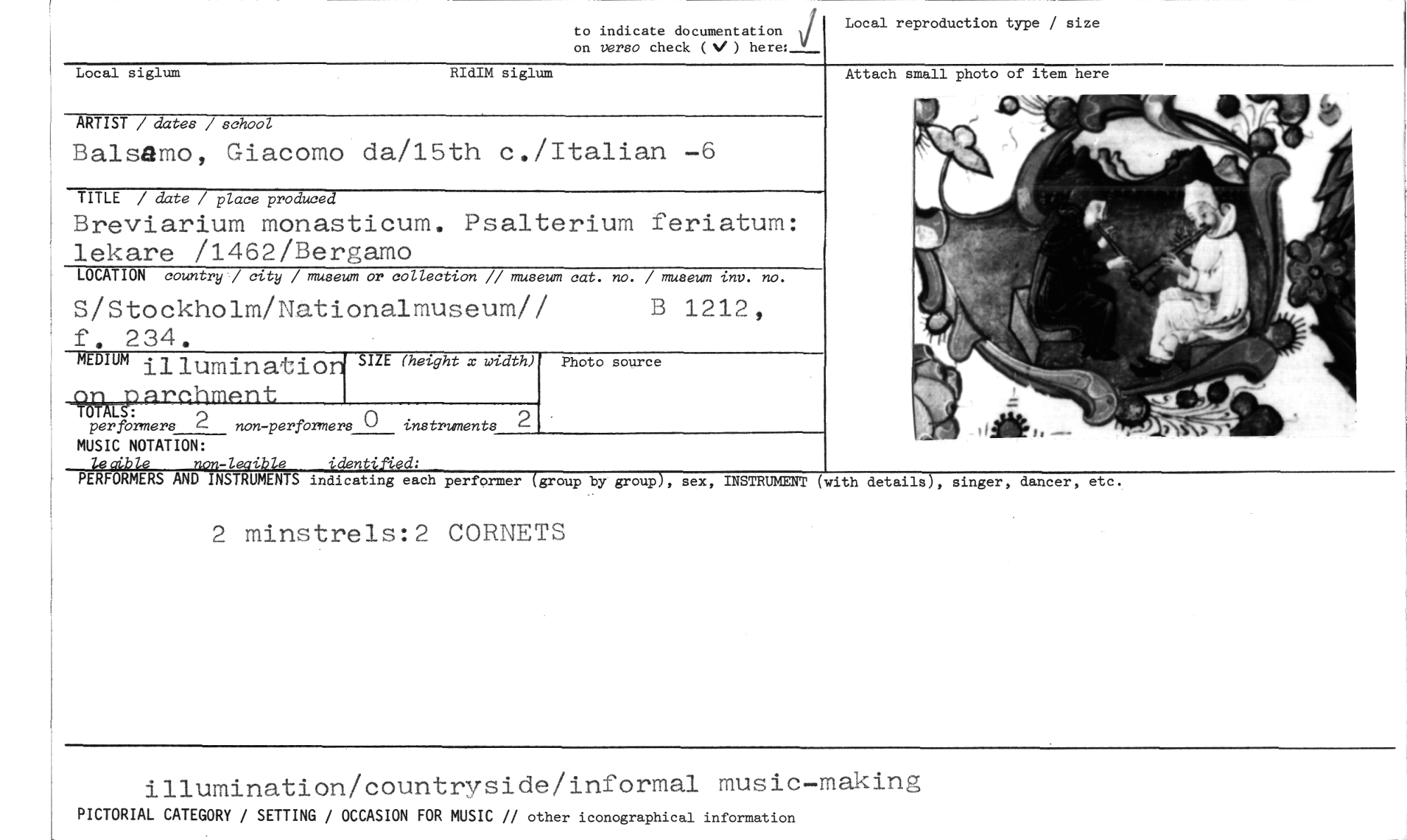 //// 2 minstrels:2 CORNETS //// illumination/countryside/informal music-making //// PICTORIAL CATEGORY / SETTING / OCCASION FOR MUSIC // other iconographical information //// RIdIM siglum //// Local siglum //// Local reproduction type / size //// on versa check ( ) here" to indicate documentation //// ARTIST / dates / school //// Balsamo, Giacomo da/15th c./Italian -6 //// TITLE / date / place produced //// Breviarium monasticum. Psalterium feriatum: lekare /1462/Bergamo //// LOCATION country / city / museum or collection // museum cat. no. / museum inv. no. //// S/Stockholm/Nationalmuseum// B 1212, //// f 234. //// illumination SIZE (height x width) Photo source //// _959Aurrnhment //// per formers 2 non-performers 0 instruments //// MUSIC NOTATION: //// leurible non-leaibie identified: //// PERFORMERS AND INSTRUMENTS indicating each performer (group by group), sex, INSTRUMENT (with details), singer, dancer, //// Attach small photo of item here //// etc. ////