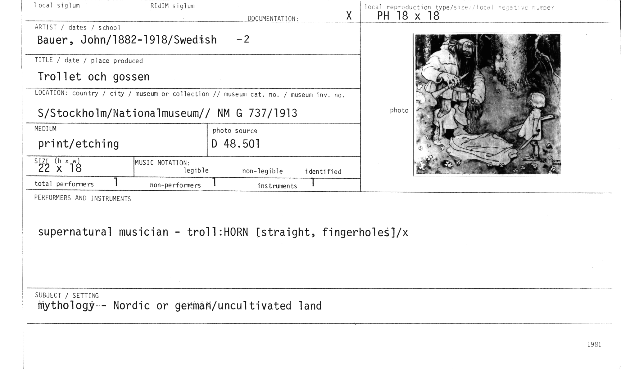 //// PERFORMERS AND INSTRUMENTS //// supernatural musician - troll:HORN [straight, fingerholes]/x //// SUBJECT / SETTING //// mythology.- Nordic or germah/uncultivated land //// local siglum RIdIM sigiuw //// DOCUMENTATION: //// local reproduction type/sizu locu c,,her //// )( PH 18 x 18 //// MUSIC NOTATION: //// legible //// non-legible identified //// photo //// 1 //// non-performers instruments //// ARTIST / dates / school //// Bauer, John/1882-1918/Swedish —2 //// TITLE / date / place produced //// Trollet och gossen //// LOCATION: country / city / museum or collection // museum cat. no. / museum inv. no. //// S/Stockholm/Nationalmuseum// NM G 737/1913 //// photo source //// D 48.501 //// sizE (h x wl //// 22 x 18 //// total performers 1 //// MEDIUM //// print/etching ////