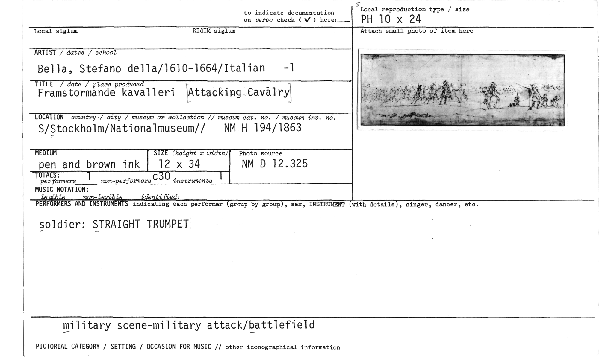 //// to indicate documentation //// on verso check (V ) here: //// 5- //// Local reproduction type / size //// PH 10 x 24 //// Attach small photo of item here //// Local siglum RIdIM siglum //// ARTIST / dates / school //// Bella, Stefano della/1610-1664/Italian -1 //// TITLE / date / place produced //// Framstormande kavalleri lAttacking Cavålry //// LOCATION country / city / museum or collection // museum cat. no. / museum inv. no. //// S/Stockholm/Nationalmuseum// NM H 194/1863 //// MEDIUM SIZE (height x width) Photo source //// pen and brown ink 12 x 34 NM D 12.325 //// //// -MAB: 1 c30 1 //// performers non-performers i //// nstruments //// MUSIC NOTATION: //// le,ible non-leaible identified: //// PERFORMERS AND INSTRUMENTS indicating each performer (group by group), sex, INSTRUMENT (with details), singer, dancer, etc. //// soldier: STRAIGHT TRUMPET. //// military scene-military attack/battlefield //// PICTORIAL CATEGORY / SETTING / OCCASION FOR MUSIC // other iconographical information ////