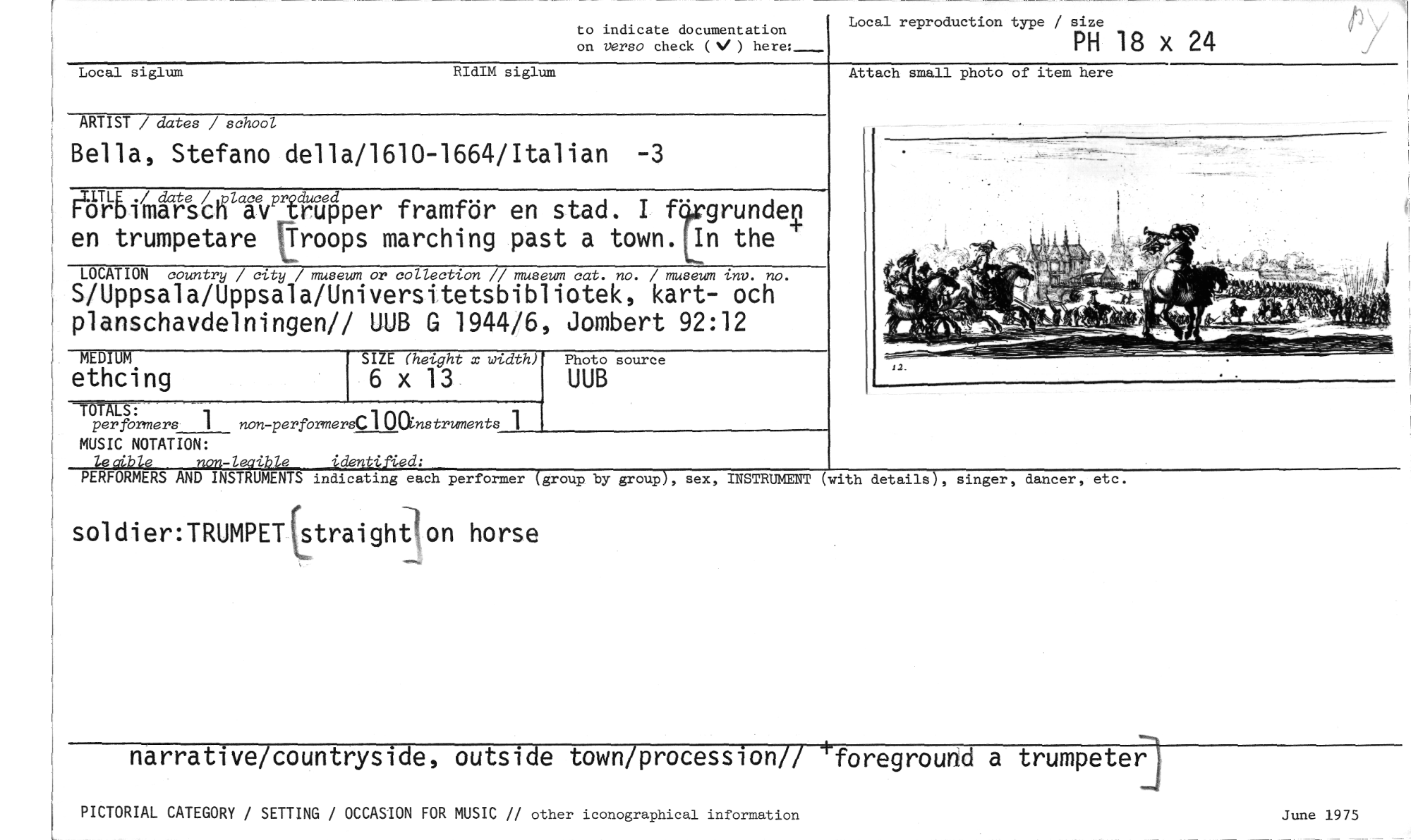 //// to indicate documentation on verso check (V) //// Local reproduction type / size //// PH 18 x 24 //// Attach small photo of item here //// Local siglum RIdIM siglum //// ARTIST / dates / school //// Bella, Stefano della/1610-1664/Italian -3 //// ägi'mårt'esCICWIPOper framför en stad. I f" grunden //// en trumpetare r_roops marching past a town. In the //// LOCATION country / city / museum or collection // museum cat. no. / museum inv. ruo. //// S/Uppsala/Uppsala/Universitetsbibliotek, kart- och planschavdelningen// UUB G 1944/6, Jombert 92:12 //// MEDIUM SIZE (height x width) Photo source //// ethcing 6 x 13 UUB //// -TOTALS: //// perfbrmers 1 non-performers(21()(Instruments 1 //// MUSIC NOTATION: //// Zeaible non-legible identtfied, //// PERFORMERS AND INSTRUMENTS indicating each performer (group by group), sex, INSTRUMENT (with detaila-), singer, dancer, etc. //// soldier:TRUMPET(straighilon horse //// narrative/countryside, outside town/procession// Tforeground a trumpeter //// PICTORIAL CATEGORY / SETTING / OCCASION FOR MUSIC // other iconographical information June 1975 ////