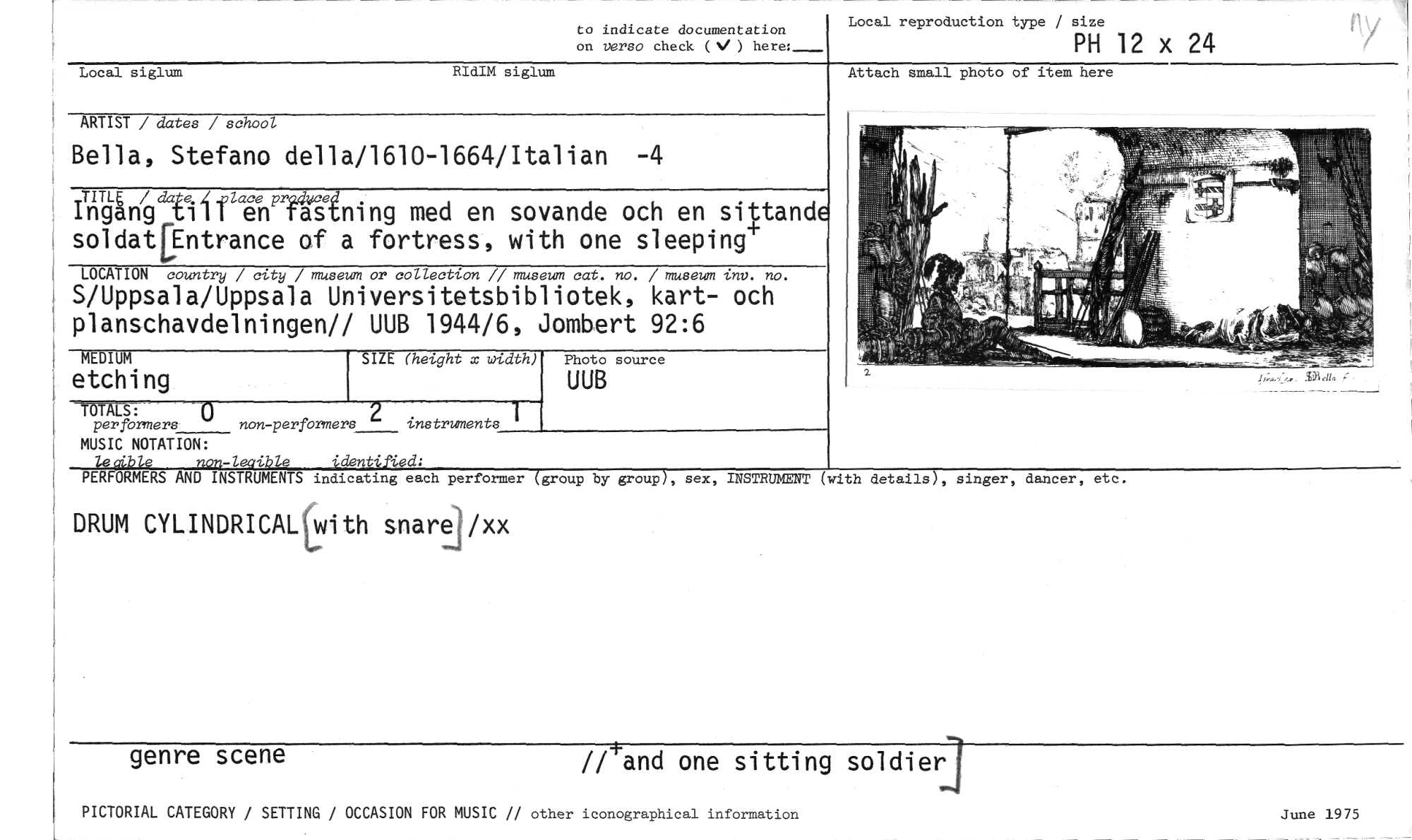 //// to indicate documentation on verso check (N/ ) //// Local reproduction type / size //// PH 12 x 24 //// Local siglum RIdIM siglum //// ARTIST / dates / school //// Bella, Stefano della/1610-1664/Italian -4 //// Ingineeiiegerntning med en sovande och en sittande soldat Entrance of a fortress, with one sleeping+ //// LOCATION country / city / museum or collection // museum cat. no. / museum //// S/Uppsala/Uppsala Universitetsbibliotek, kart- och planschavdelningen// UUB 1944/6, Jombert 92:6 //// MEDIUM SIZE (height x width) Photo source //// etching UUB //// Attach small photo of item here //// TOTALS: 0 2 1 //// perfbrmers non-performers i //// mstruments //// MUSIC NOTATION: //// tecdble non-leqible _identified, //// PERFORMERS AND INSTRUMENTS indicating each performer (group by group), sex, INSTRUMENT (with details), singer, dancer, etc. //// DRUM CYLINDRICALtwith snarej/xx //// genre scene // and one sitting soldier //// PICTORIAL CATEGORY / SETTING / OCCASION FOR MUSIC // other iconographical information June 1975 ////