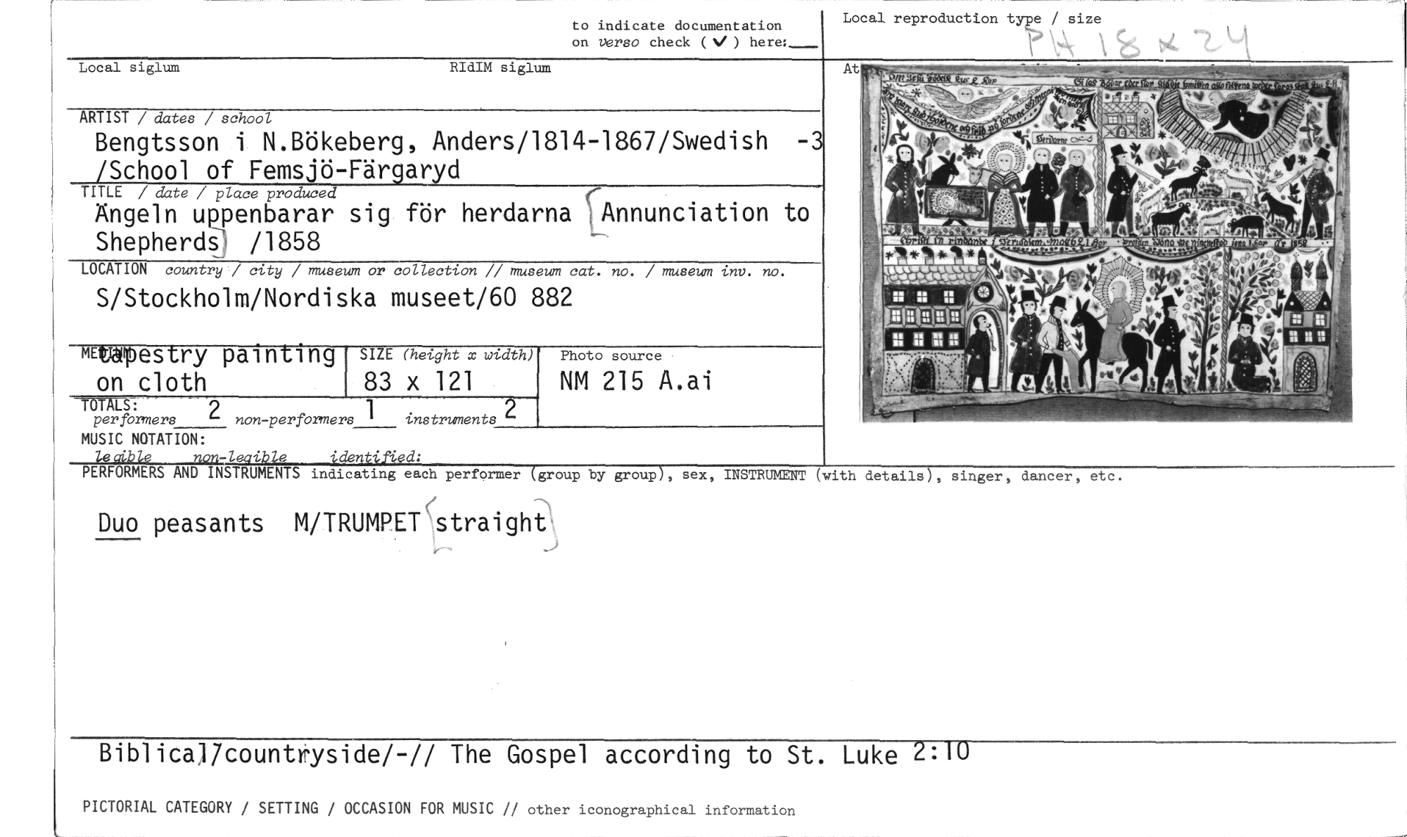 //// ARTIST / dates / school //// Bengtsson i N.Bökeberg, Anders/1814-1867/Swedish -3 //// /School of Femsjö-Färgaryd //// TITLE / date / place produced //// Ängeln uppenbarar sig för herdarna )Annunciation to Shepherdå /1858 //// LOCATION country / city / museum or collection // museum cat. no. / museum inv. no. //// S/Stockholm/Nordiska museet/60 882 //// mulpestry painting SIZE (height x width) //// on cloth 83 x 121 //// -TUM: //// perfbrmers 2 non-perfOrmem 1 instruments //// MUSIC NOTATION: //// leaible non-leaible identified, //// PERFORMERS AND INSTRUMENTS indicating each performer (group by group), sex, INSTRUMENT (with details), singer, dancer, etc. //// Duo peasants M/TRUMPET straight //// Biblical7countryside/-// The Gospel according to St. Luke 2:10 //// PICTORIAL CATEGORY / SETTING / OCCASION FOR MUSIC // other iconographical information //// to indicate documentation on versa check (.4., ) //// otal siglum RIdIM siglum //// Photo source //// NM 215 A.ai ////