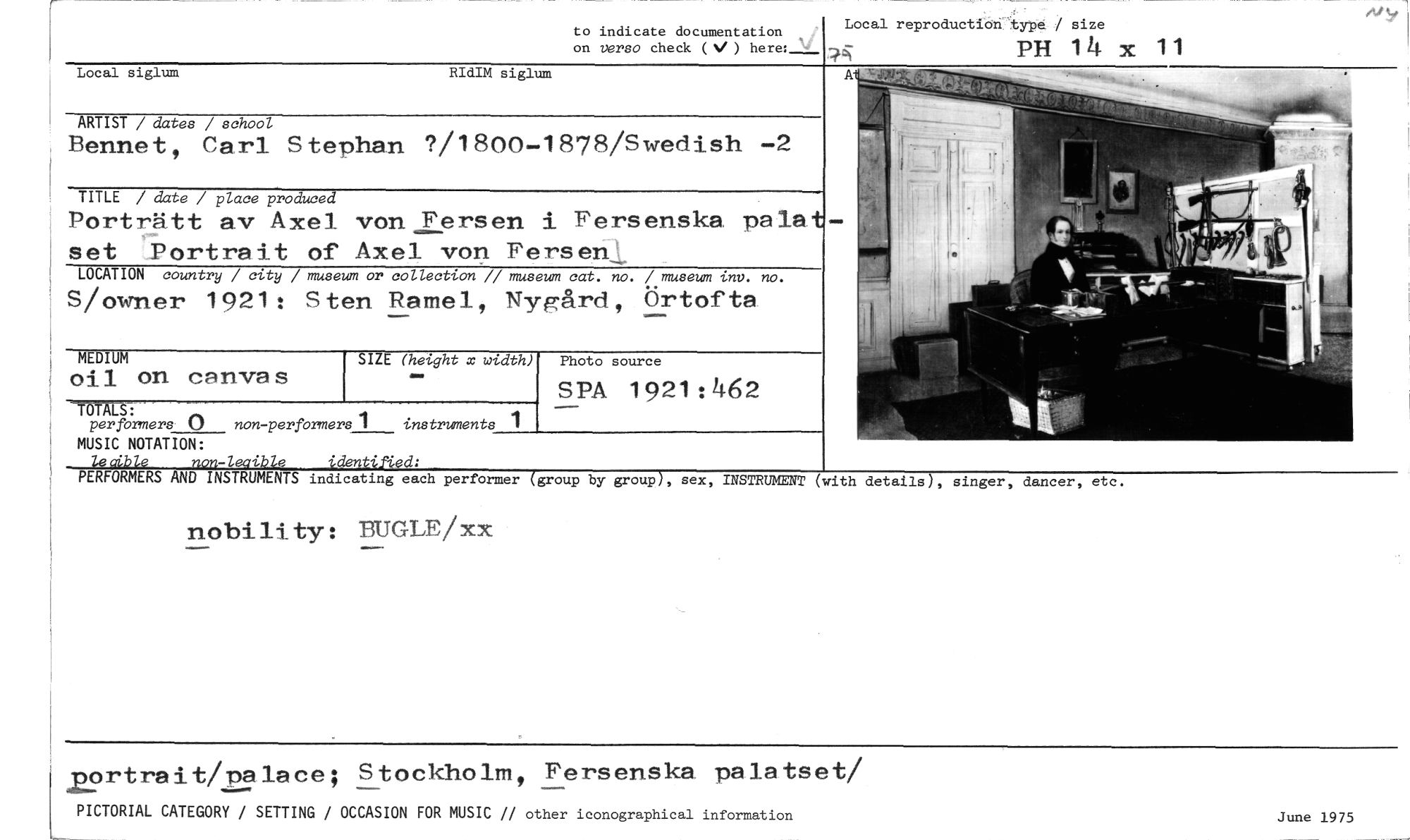 //// r //// to indicate documentation on verso check (V) here:_--- //// Local siglum RIdIM siglum //// ARTIST / dates / school //// Bennet, Carl Stephan ?/1800-1878/Swedish -2 //// TITLE / date / place produced //// Porträtt av Axel von Fersen i Fersenska palat set Portrait of Axel von Fersen //// LOCATION country / city / museum or collection // museum cat. no. / museum inv. no. //// S/owner 1921: Sten Ramel, Nygård, Örtof ta //// SIZE (height x eidth) //// on canvas //// TOTALS: //// performers 0 non-performers 1 instruments //// MUSIC NOTATION: //// lecible non-legible -klentiefrled, //// MEDIUM //// Photo source //// SPA 1921:462 //// Local reproduction type / size //// PH 14 x 11 //// PERFORMERS AND INSTRUMENTS indicating each performer (group by group), sex, INSTRUMENT (with details), singer, dancer, etc. //// nobility: BUGLE/xx //// wrtrait/palace; Stockholm, Fersenska palatset/ June 1975 //// PICTORIAL CATEGORY / SETTING / OCCASION FOR MUSIC // other iconographical information ////