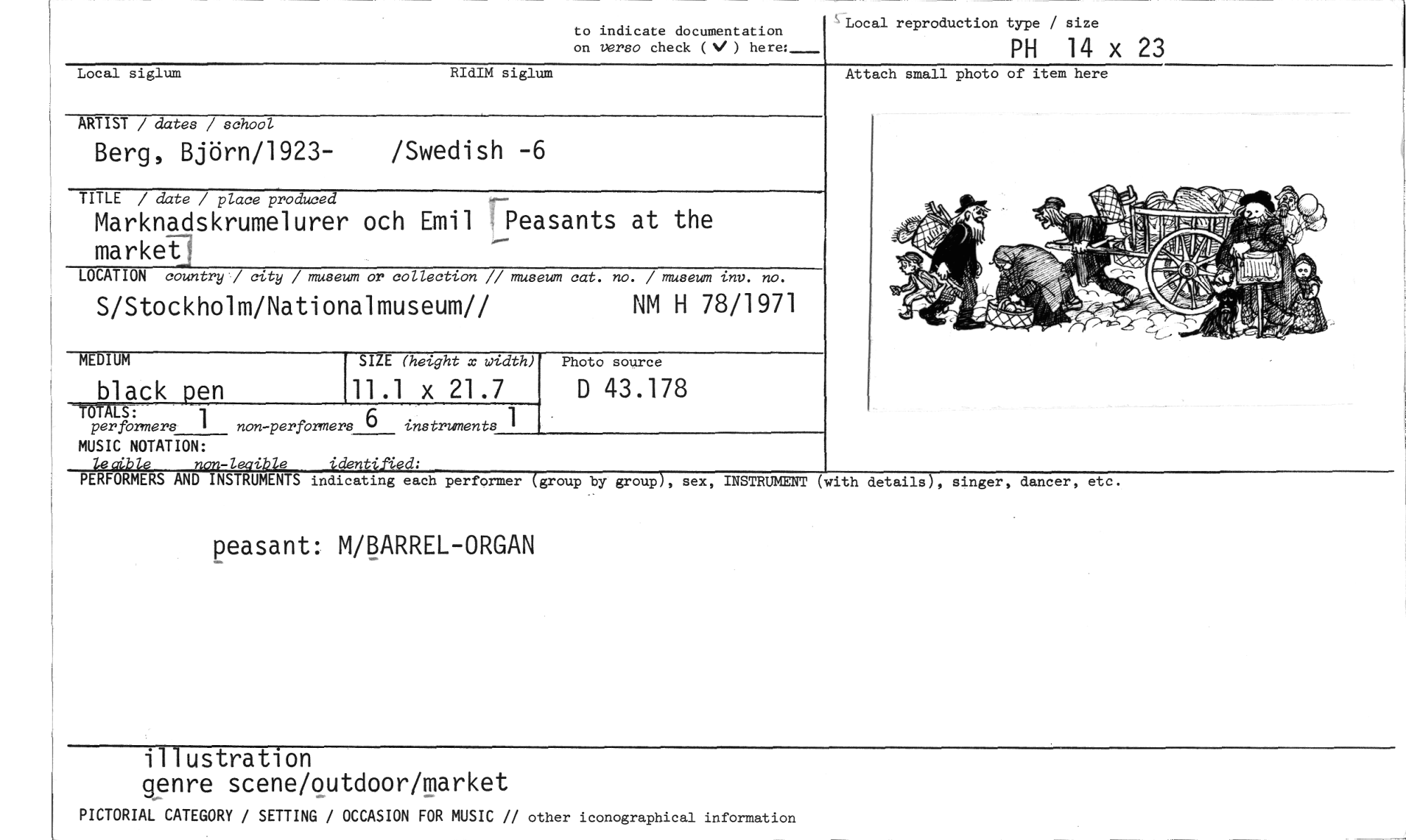 //// to indicate documentation //// on versa check (V ) here:___ //// 'Local reproduction type / size //// PH 14 x 23 //// Local siglum RIdIM siglum Attack small photo of item here //// ARTIST / dates / school /Swedish -6 //// Berg, Björn/1923- //// TITLE / date / place produced //// Marknadskrumelurer och Emil ,Peasants at the //// markett //// LOCATION country / city / museum or collection // museum cat. no. / museum inv. no. //// S/Stockholm/Nationalmuseum// NM H 78/1971 //// MEDIUM SIZE (hetght x width) Photo source //// black pen 11.1 x 21.7 D 43.178 //// //// perfbrmers 1 non-perfOrmers 6 instruments //// MUSIC NOTATION: //// Zeaible non-leaible identified, //// PERFORMERS AND INSTRUMENTS indicating each performer (group by group), sex, INSTRUMENT (with detailsY, singer, dancer, etc. //// peasant: M/BARREL-ORGAN //// illustration //// genre scene/outdoor/market //// PICTORIAL CATEGORY / SETTING / OCCASION FOR MUSIC // other iconographical information ////