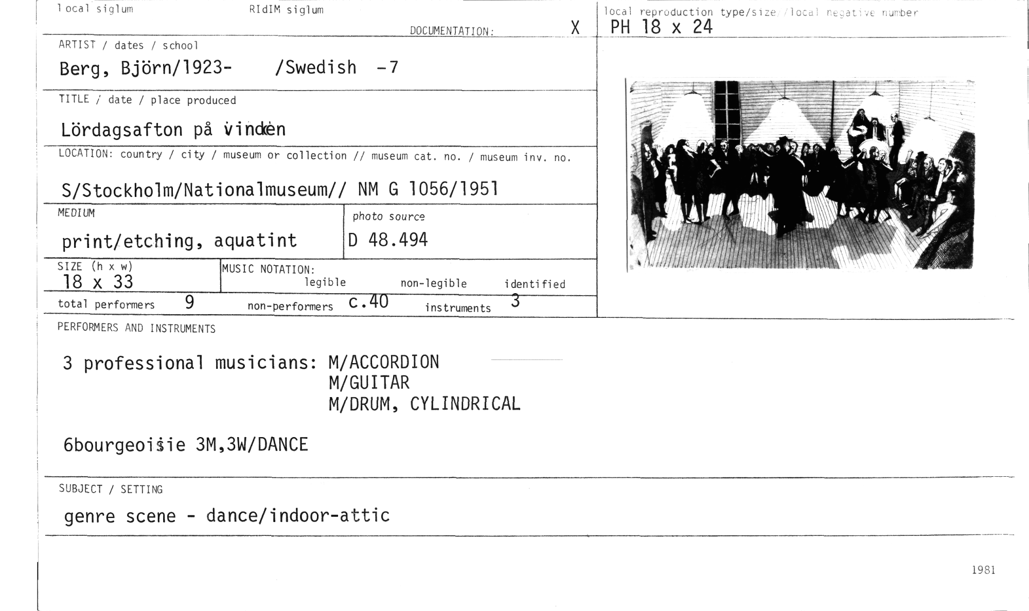 //// 1 ocal siglum RIdIM siglum local reproduction type/size lo:... nxter //// PH 18 x 24 //// DOCUMENTATION: //// ARTIST / dates / school //// Berg, Björn/1923- /Swedish —7 //// TITLE date / place produced //// Lördagsafton på Vind-ån //// //// LOCATION: country / city / museum or collection // museum cat. no. / museum inv no. //// S/Stockholm/Nationalmuseum// NM G 1056/1951 //// MEDIUM photo source //// print/etching, aquatint D 48.494 //// SIZE (h x w) MUSIC NOTATION: //// 18 x 33 legible non-legible identified //// total performers 9 non-performers C .40 instruments 3 //// //// //// PERFORMERS AND INSTRUMENTS //// 3 professional musicians: M/ACCORDION //// M/GUITAR //// M/DRUM, CYLINDRICAL //// 6bourgeoi%ie 3M,3W/DANCE //// 'JR.JUCT / SETTING //// genre scene - dance/indoor-attic //// 198 ////
