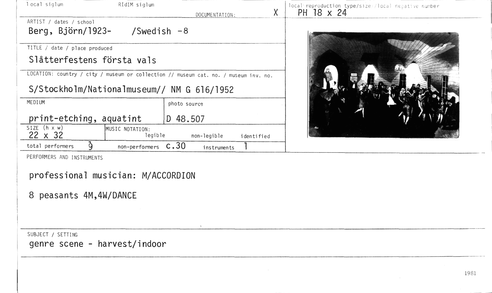 //// PERFORMERS AND INSTRUMENTS //// professional musician: M/ACCORDION 8 peasants 4M,4W/DANCE //// SUBJECT / SETTING //// genre scene - harvest/indoor //// 1 otal siglum RIdIM SUf //// DOCUMENTATION: x //// MUSIC NOTATION: //// legible non-legible i denti fi ed //// SI ZE (h x w) //// 22 x 32 //// total performers non-performers C .30 instruments //// ARTIST / dates / school //// Berg, Björn/1923- //// TITLE / date / place produced //// Slåtterfestens första vals //// LOCATION: country / city / museum or collection // museum cat. no. / museum inv. no. //// S/Stockholm/Nationalmuseum// NM G 616/1952 //// MEDIUM //// print-etchin , aquatint //// local reproduction type/size 1 oca nt . t. ,e nu,ber //// PH 18 x 24 //// /Swedish —8 //// photo source //// D 48.507 ////
