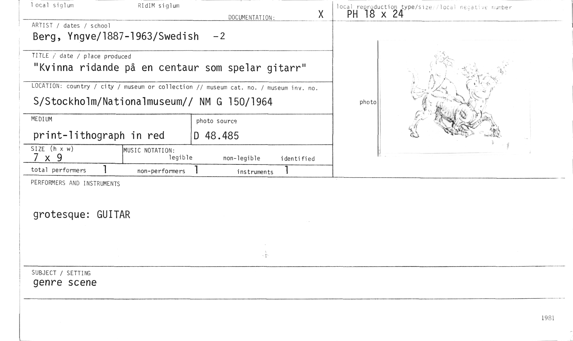 //// lotal siglum RIdIM siglum DOCUMENTATION: lotal reproducti on type/s i ze../lotal negative nurober //// X PH 18 x 24 //// //// PERFORMERS AND INSTRUMENTS //// grotesque: GUITAR //// SUBJECT / SETTING //// genre scene //// MUSIC NOTATION: //// legible non-legible identified //// SIZE (h x w) //// 7 x 9 //// total performers 1 //// non-performers //// instruments 1 //// ,`,'• //// (4. • if, //// k: //// photo //// ARTIST / dates / school //// Berg, Yngve/1887-1963/Swedish —2 //// TITLE / date / place produced //// "Kvinna ridande på en centaur som spelar gitarr" //// LOCATION: country / city / museum or collection // museum cat. no. / museum inv. no. //// S/Stockholm/Nationalmuseum// NM G 150/1964 //// MEDIUM //// print-lithograph in red //// photo source //// D 48.485 //// 1981 ////