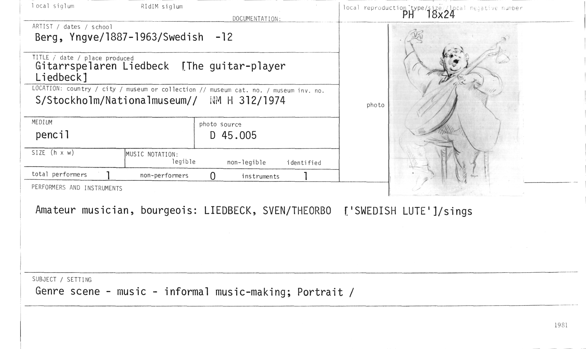 //// local siqlum RIdIM siglum //// DOCUMENTATION: //// ARTIST / dates / school //// Berg, Yngve/1887-1963/Swedish -12 //// TITLE i date / place produced //// Gitarrspelaren Liedbeck [The guitar-player Liedbeck] //// LOCATION: country / city / museum or collection // museum cat. no. / museum inv no. //// S/Stockholm/Nationalmuseum// M H 312/1974 //// pencil //// SIZE (h x w MUSIC NOTATION: //// legible non-legible identified //// non-performers U instruments 1 //// local reproductiogypeL5ize noter //// 18x24 //// photo //// photo source //// D 45.005 //// total performers 1 //// PERFORMERS AND INSTRUMENTS //// Amateur musician, bourgeois: LIEDBECK, SVEN/THEORBO ['SWEDISH LUTE']/sings //// SUBJECT / SETTING //// Genre scene - music - informal music-making; Portrait / ////