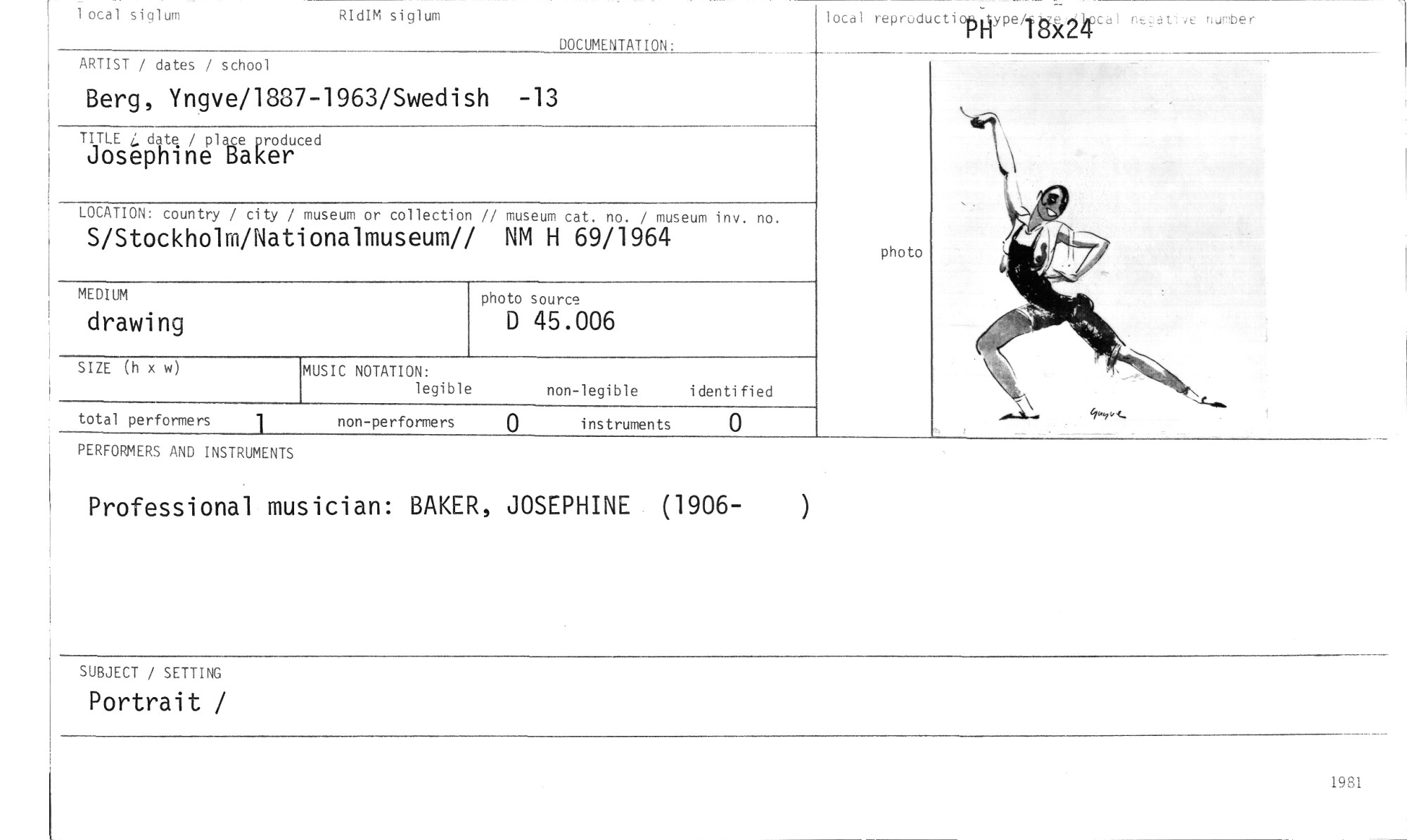 //// I otal siolum RIdIM siolom //// lotal repruciuctiotsnype/igk2k, //// ,T• • ,-ner //// DOCUMENTAT ION //// ARTIST / dates / school //// Berg, Yngve/1887-1963/Swedish -13 //// ' TITLE date. / pl ase produced //// Josephine Baker //// LOCATION: country / city / museum or collection // museum cat. no. / museum i nv . no. //// S/Stockholm/Nationalmuseum// NM H 69/1964 //// photo source //// D 45.006 //// SIZE (h x w) MUSIC NOTATION: //// legi bl e non-legible i denti fi ed //// total performers 1 non-performers 0 instruments 0 //// drawing //// photo //// 4 //// PERFORMERS AND INSTRUMENTS //// Professional musician: BAKER, JOSEPHINE (1906- //// SUBJECT / SETTING //// Portrait / //// 19T1 ////