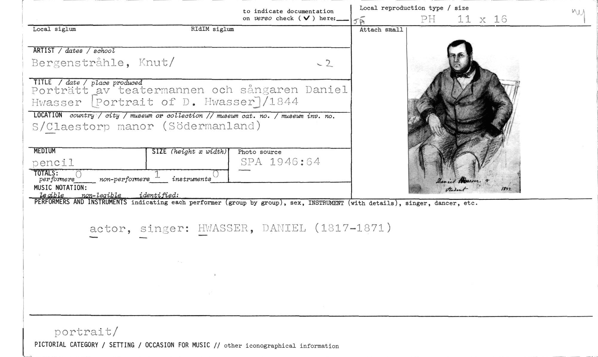 //// Local reproduction type / size SP //// x 13 //// to indicate documentation //// on verso check (V) here: //// Local siglum RIdIM siglum //// ARTIST / dates / school //// 1 Bergenstråhle, Knut/ - //// TITLE / date / place produced //// Porträtt av teatermannen och sångaren Daniel Hwasser rPortrait of D. Hwasserl/1844 //// LOCATION country / city / museum or collection // museum cat. no. / museum inv. no. //// S/Claestorp maner (Sbdormanlanl) //// Attach small //// i/ //// MEDIUM //// nencil //// SIZE (hetght x width) //// Photo source //// SPA 1946:64 //// -MAB: C) //// perförmers non-perförmers instruments //// MUSIC NOTATION: //// lecible non-leaible identified: //// PERFORMERS AND INSTRUMENTS indicating each performer (group by group), sex, INSTRUMENT (with details), singer, dancer, etc. //// actor, HWASSER, DANIEL (1817-1871) //// portrait/ //// PICTORIAL CATEGORY / SETTING / OCCASION FOR MUSIC // other iconographical information //// o...,;,;44.2;;1- //// /tys: ////