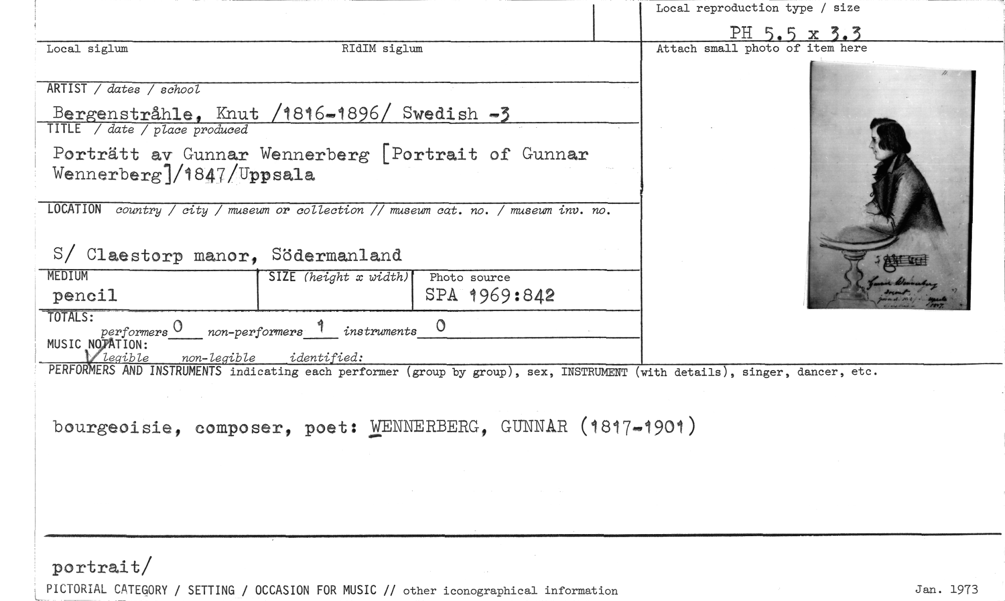 //// Local reproduction type / size //// PH 5.5 x 3.3 //// Local siglum RIdIM siglum //// ARTIST / dates / school //// Bergenstråhle, Knut /1816-1896/ Swedish -3 //// TITLE / date / place produced //// Porträtt av Gunnar Wennerberg [Portrait of Gunnar Wennerberg]/1847/Uppsala, //// LOCATION country / city / museum or collection // museum cat. no. / museum inv. no. //// S/ Claestorp inanor, Södermanland Attach small photo of item here //// MEDIUM SIZE (height x width) Photo source //// pencil SPA 1969:842 //// //// performers U non-performers 1 instruments 0 //// MUSIC N."TION: //// le ible non-le identi ied: //// PERFOR ERS AND INSTRUMENTS indicating each performer (group by group), sex, INSTRUMENT (with details), singer, dancer, etc //// bourgeoisie, tomposer, poet: WENNERBERG, GUNNAR (1817..1901) //// portrait/ //// PICTORIAL CATEGORY / SETTING / OCCASION FOR MUSIC // other iconographical information //// Jan. 1973 ////