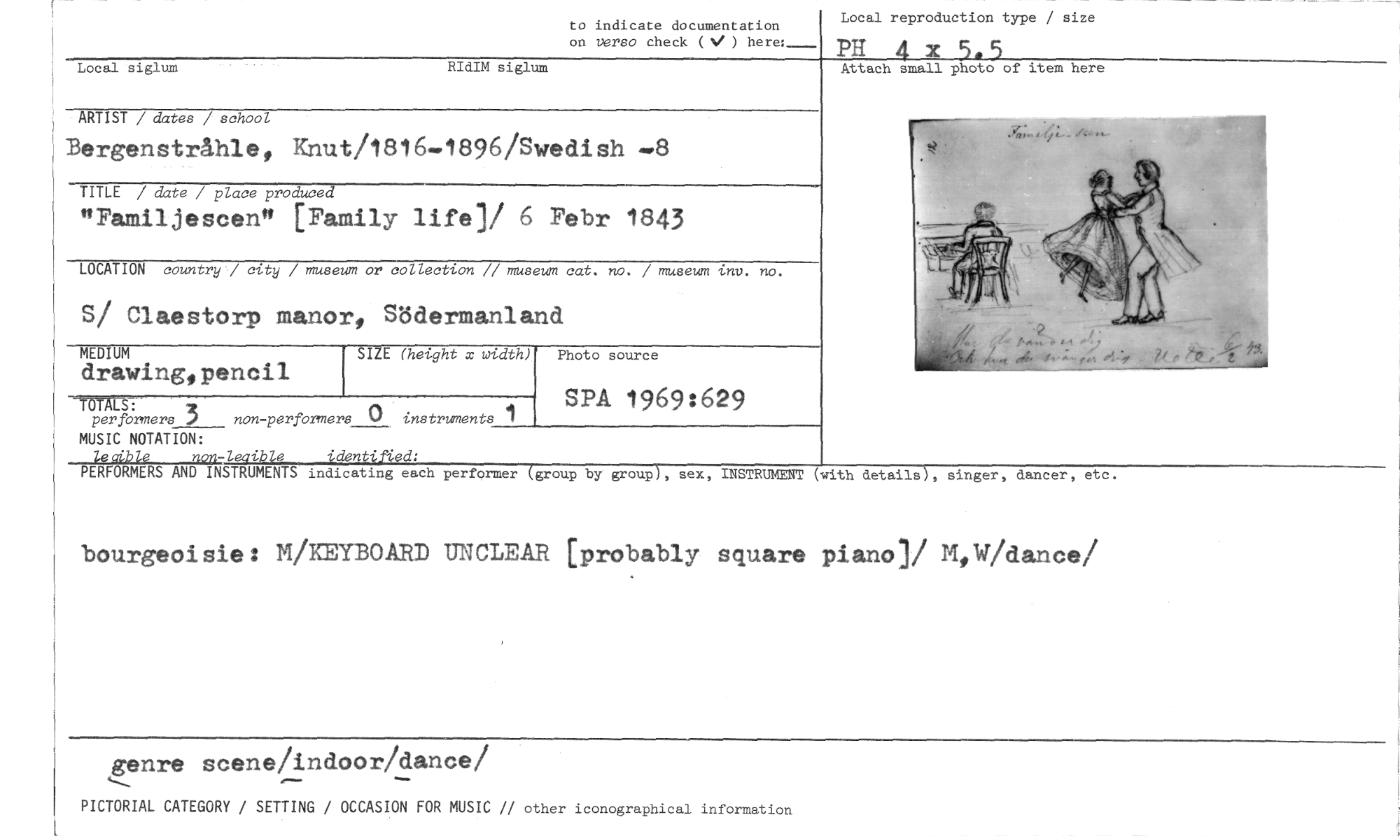//// to indicate documentation //// on verso check ( V ) here: //// Local reproduction type / size //// PH 4 x 5„5 //// Attach small photo of item here //// Local siglum RIdIM siglum //// ARTIST / dates / school //// Bergenstråhle, Knut/1816-1896/Swedish •8 //// TITLE / date / place produ72- //// "Familjescen" [Family life]i 6 Febr 1843 //// LOCATION country / city / museum or collection /7 museum cat. no. / museum inv. no. //// S/ Claestorp nianor, Södermanland //// MEDIUM //// drawing,pencil SIZE (height x width) Photo source //// 1 //// SPA 1969:629 //// T LS: //// perfbrmers 3 non -performers () instruments //// MUSIC NOTATION: //// 4e6ible nog-legible identified, //// PERFORMERS AND INSTRUMENTS indioating each performer (group by group), sex, INSTRUMENT (with details), singer, dancer, etc. //// bourgeoisie: M/KEYBOARD UNCLEAR [probably square piano]/ 1%W/dance/ //// genre seenelindoorblancedi //// PICTORIAL CATEGORY / SETTING / OCCASION FOR MUSIC // other iconographical information ////