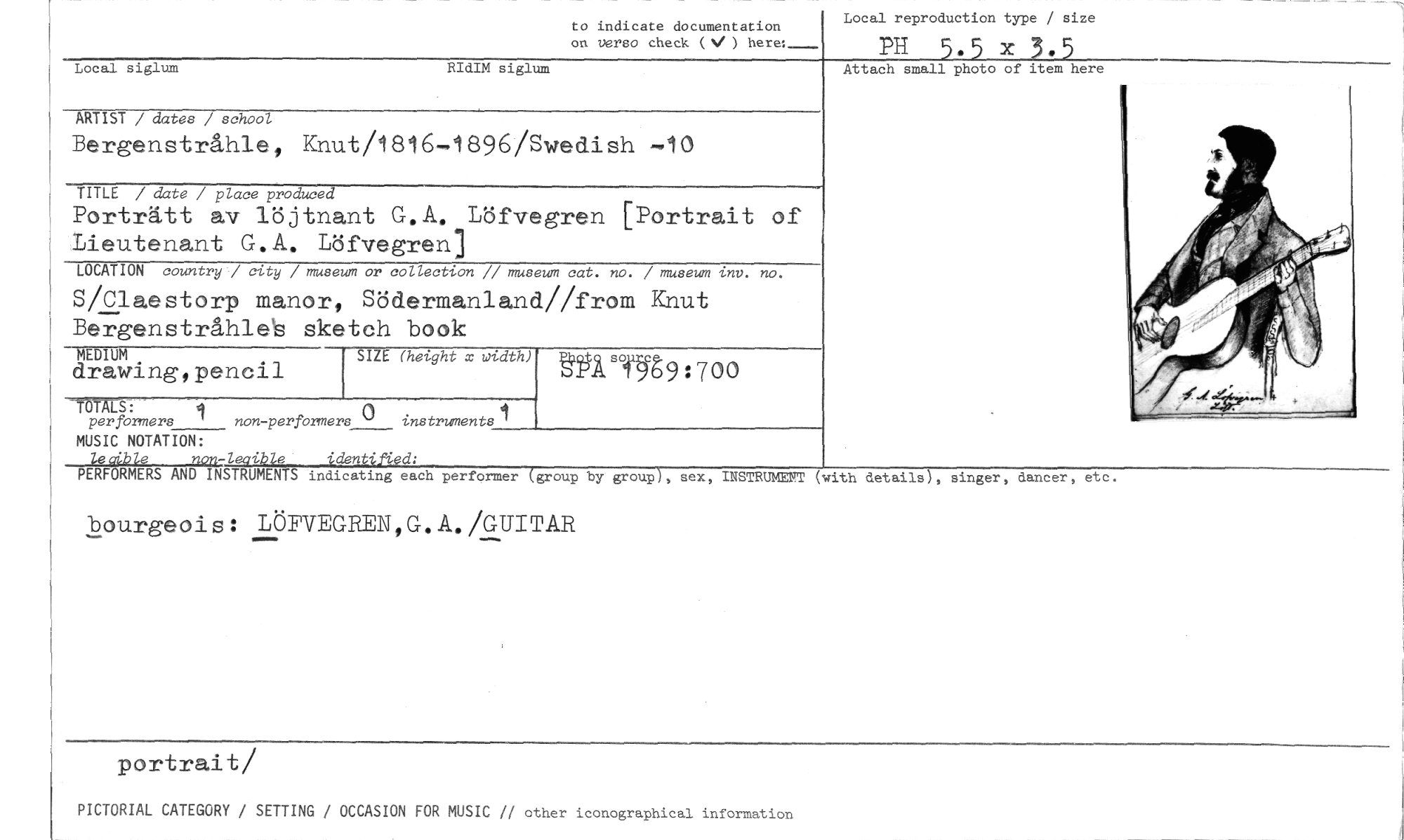 //// Local reproduction type / size //// PH 5.5 x 3.5 //// Attach small photo of item here //// to indicate documentation //// on verso check (V) here: __-- //// Local siglum RIdIM siglum //// ARTIST / dates / school //// Bergenstråhle, Knut/1816-1896/Swedish -10 //// TITLE / date / place produced //// Porträtt av löjtnant G.A. Löfvegren [Portrait of Lieutenant G.A. Löfvegren] //// LOCATION country / city / museum or collection // museum cat. no. / museum inv. no. //// S/Claestorp manor, Södermanland//from Knut Bergenstråhle's sketch book //// MEDIUM SIZE (height x width) M5Y5g9:700 //// drawing,pencil //// Te .LS: //// 1 //// per formers non-perfbrmers C) instruments //// MUSIC NOTATION: //// 4eolibie noirleaikle identified, //// PERFORMERS AND INSTRUMENTS indicating each performer (group by group), sex, INSTRUMENT (with details), singer, dancer, etc. //// bourgeois: LÖFVEGREN,G.A./GUITAR //// portrait/ //// PICTORIAL CATEGORY / SETTING / OCCASION FOR MUSIC // other iconographical information ////