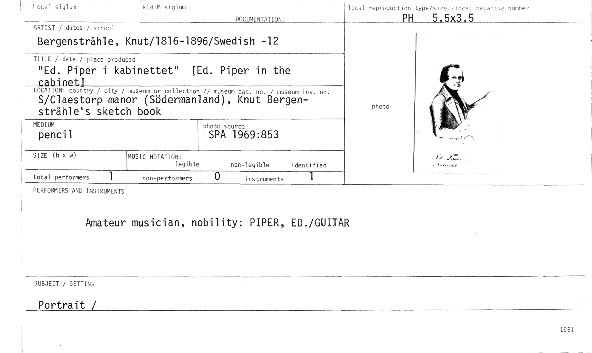 //// local siglum RIdIM siglum //// DOCUMENTATION: //// ARTIST / dates / school //// Bergenstråhle, Knut/1816-1896/Swedish -12 //// TITLE i date / place produced //// "Ed. Piper i kabinettet" [Ed. Piper in the //// cabinet] //// LOCATION: country / city / museum or collection // museum cat. no. / museum inv. no. //// S/Claestorp manor (Södermanland), Knut Bergenstråhle's sketch book //// photo source //// SPA 1969:853 //// local reproduction type/size ,, //// PH 5.5x3.5 //// MEDIUM //// pencil //// SIZE (h x w //// f; //// MUSIC NOTATION: //// legible //// non-legible identified //// total performers 1 non-performers instruments 1 //// photo //// PERFORMERS AND INSTRUMENTS //// Amateur musician, nobility: PIPER, ED./GUITAR //// SUBJECT / SETTING //// Portrait / //// 1981 ////