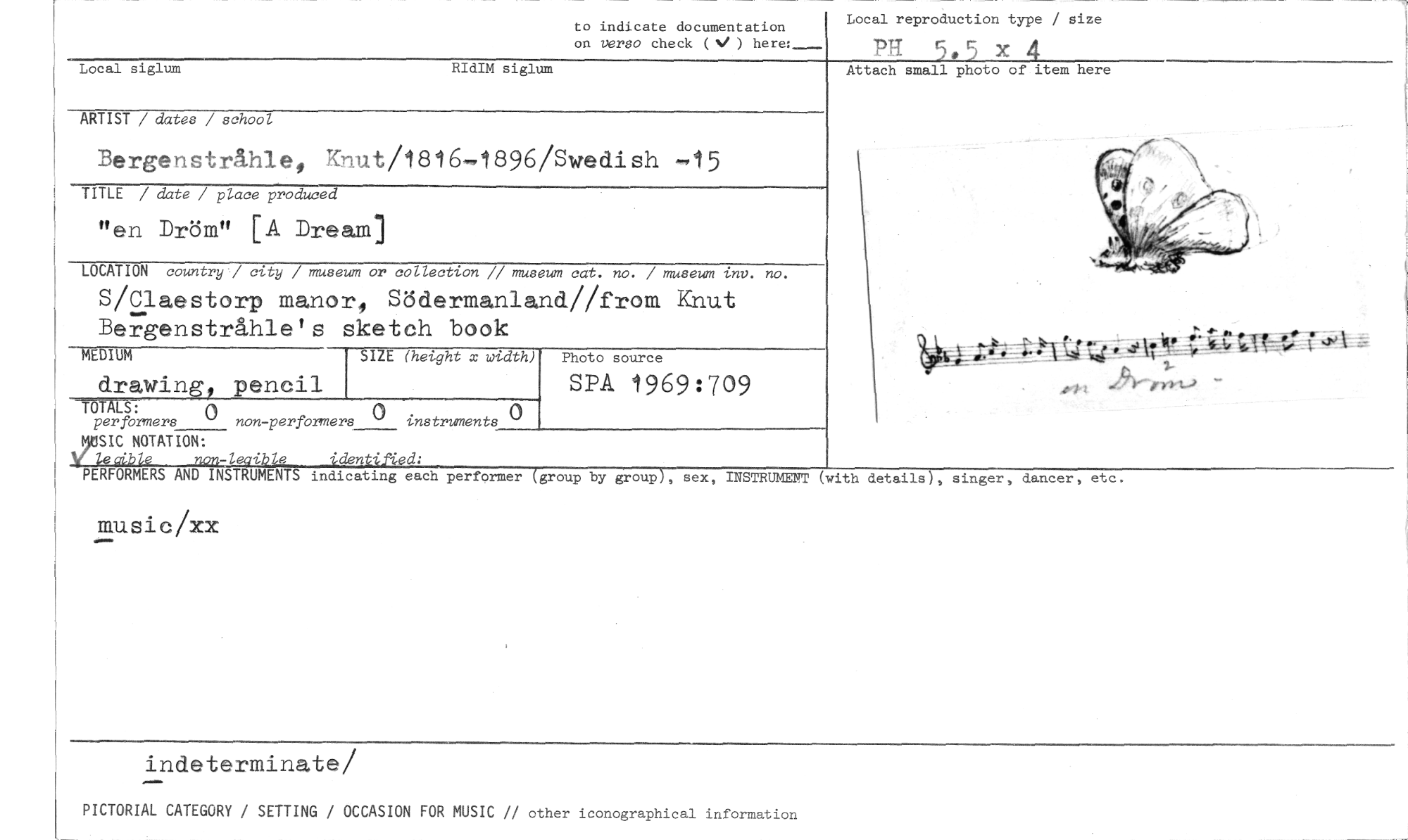 //// to indicate documentation on versa check ( ) //// Local siglum RIdIM siglum //// ARTIST / dates / school //// Bergenstråhle, Knut/1816-1896/Swedish //// TITLE / date / place produced //// "en Dröm" [A Dream] //// LOCATION country / city / museum or collection // museum cat. no. / museum inv. no. //// S/Claestorp manor, Södermanland//from Knut Bergenstråhle's sketch book //// MEDIUM SIZE (height x width) Photo source //// drawing pencil SPA 1969:709 //// T 'LS: //// per formers non -performers instruments //// SIC NOTATION: //// ,• e 'den 'ed, //// Local reproduction type / size //// pH 5.5 x 4 //// Attach small photo of item here //// ZC tfr f.7t• r //// PERFORMERS AND INSTRUMENTS indicating each performer group by group , sex, INSTRUMENT (with details), Singer, dancer, etc. //// music/xx //// indeterminate/ //// PICTORIAL CATEGORY / SETTING / OCCASION FOR MUSIC // other iconographical information ////