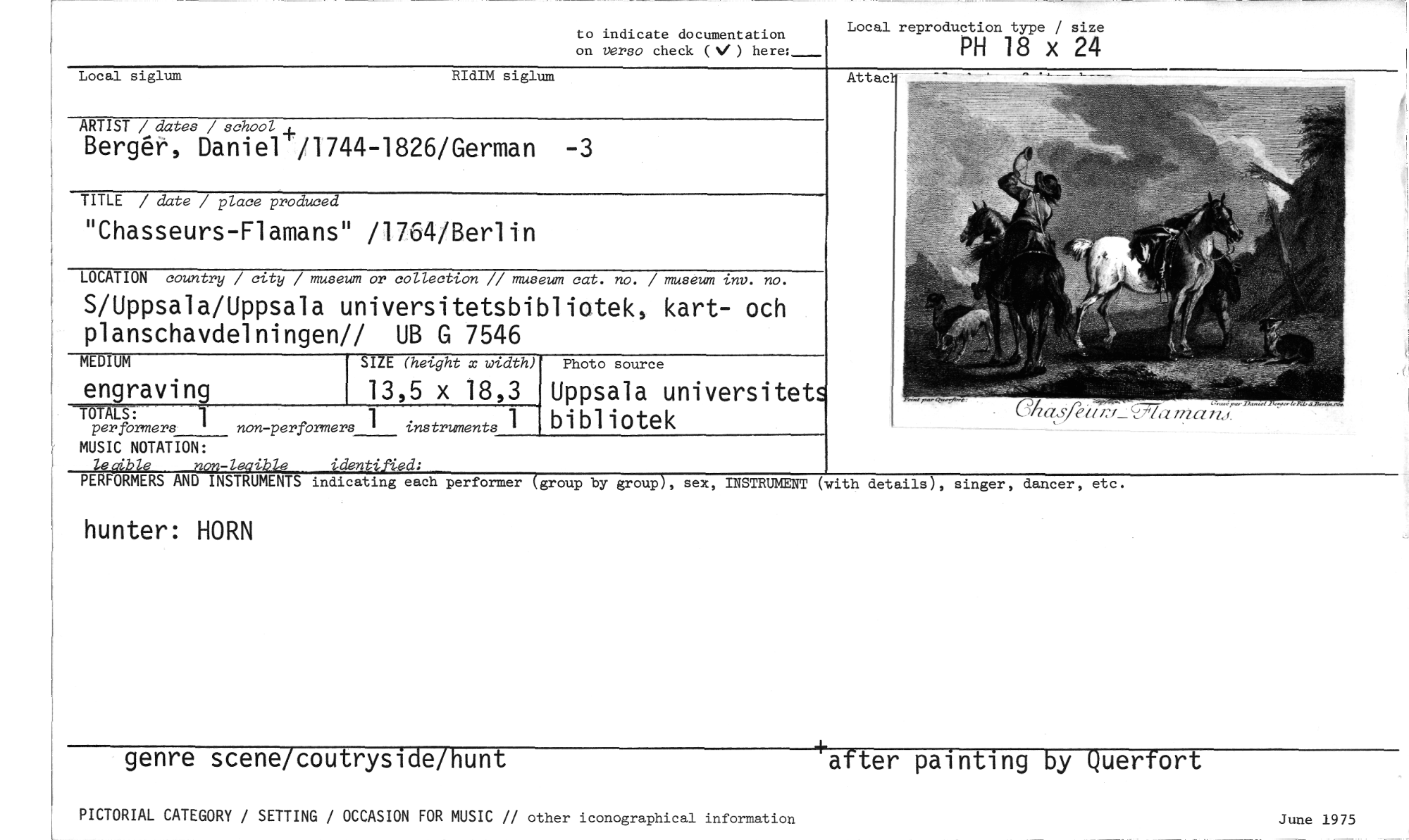 //// to indicate documentation on verso check (V ) //// Local reproduction type / size //// PH 18 x 24 //// Local siglum RIdIM siglum //// ARTIST /.dates / school + //// Berger, Daniel /1744-1826/German -3 //// TITLE / date / place produced //// "Chasseurs-Flamans" /1764/Berlin //// LOCATION country / city / museum or collection // museum cat. no. / museum inv. no. //// S/Uppsala/Uppsala universitetsbibliotek, kart- och planschavdelningen// UB G 7546 //// MEDIUM SIZE (height x width) //// engraving 13,5 x 18,3 //// TOTALS: 1 //// perfbrmers non-perförmers 1 instruments //// Photo source //// Uppsala universitets bibliotek //// MUSIC NOTATION: //// legible non-legible identified, //// PERFORMERS AND INSTRUMENTS indicating each performer (group by group), sex, INSTRUMENT (with details), singer, daner, etc. //// hunter: HORN //// genre scene/coutrysideaunt + after painting by Querfort //// PICTORIAL CATEGORY / SETTING / OCCASION FOR MUSIC // other iconographical information June 1975 ////