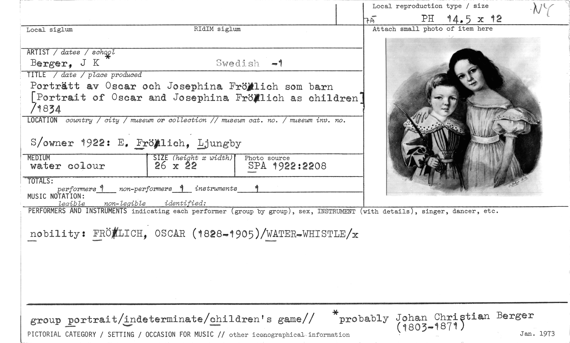 //// Local reproduction type / size //// -14". PH 14.5 x 12 //// Attach small photo of item here //// Local siglum RIdIM siglum //// ARTIST / dates / schol //// Berger, J K 3wedjs -1 //// TITLE / date / place produced //// Porträtt av Oscar och Josephina FrUlich som [Portrait of Oscar and Josephina Fröitlich as /1834 //// LOCATION country / city / museum or collection // museum cat. no. / museum inv. no. //// S/owner 1922: E, FOlich, Ljungby //// performers 1 non-performers_l__ instruments 1 //// MUSIC NOTATION: //// legible non-legible identified: //// PERFORMERS AND INSTRUMENTS indicating each performer (group by group), sex, INSTRUMENT //// nobility: FRö#LICH, OSCAR (1828•1905)/WATER-WHISTLE/x //// MEDIUM //// water solour //// SIZE (hei ht x width) //// 26 x 22 //// Photo source //// SPA 1922:2208 //// barn children] //// (with details), singer, dancer, etc. //// group portrait/indeterminate/children's game// *probably Johan ChriQtian Berger //// (1803-1871) //// PICTORIAL CATEGORY / SETTING / OCCASION FOR MUSIC // other iconographical information //// Jan. 1973 ////