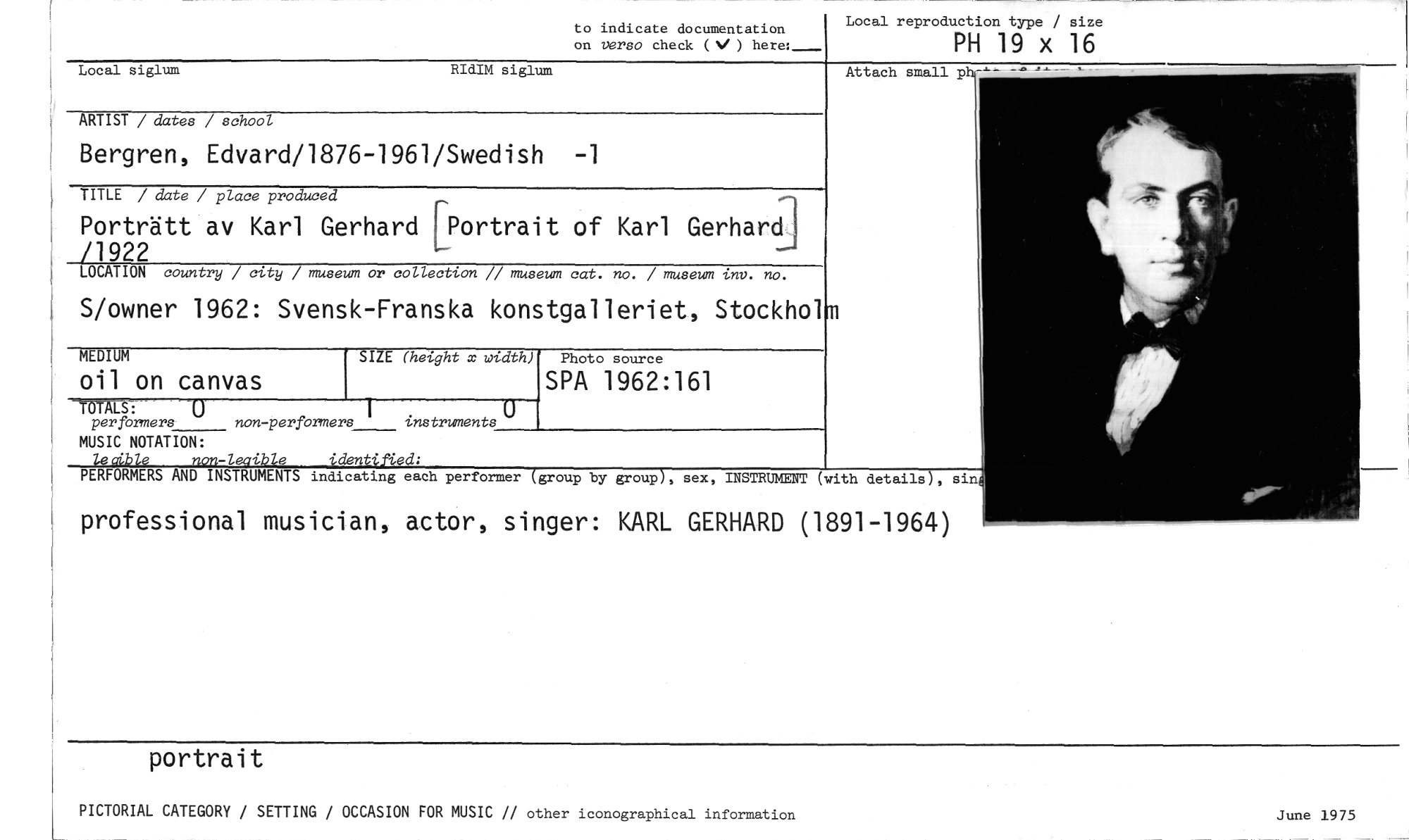 //// portrait //// PICTORIAL CATEGORY / SETTING / OCCASION FOR MUSIC // other iconographical information June 1975 //// to indicate documentation //// on verso check (V) here,- //// Local reproduction type / size //// PH 19 x 16 //// Local siglum RIOIM siglum //// ARTIST / dates / school //// Bergren, Edvard/1876-1961/Swedish -1 //// TITLE / date / place produced //// Porträtt av Karl Gerhard Portrait of Karl Gerhard //// /1922 //// LOCATION country / city / museum or collection // museum cat. no. / museum inv. no. //// S/owner 1962: Svensk-Franska konstgalleriet, Stockhol //// Attach small //// MEDIUM SIZE (height x width) SPA 1962:161 //// oil on canvas //// =AB: 0 //// perfbrmers non-perförmers instruments° //// MUSIC NOTATION: //// Zeaible non-leaible identified: //// PERFORMERS AND INSTRUMENTS indicating each performer (group by group), sex, INSTRUMENT (with details), sin //// professional musician, actor, singer: KARL GERHARD (1891-1964) ////