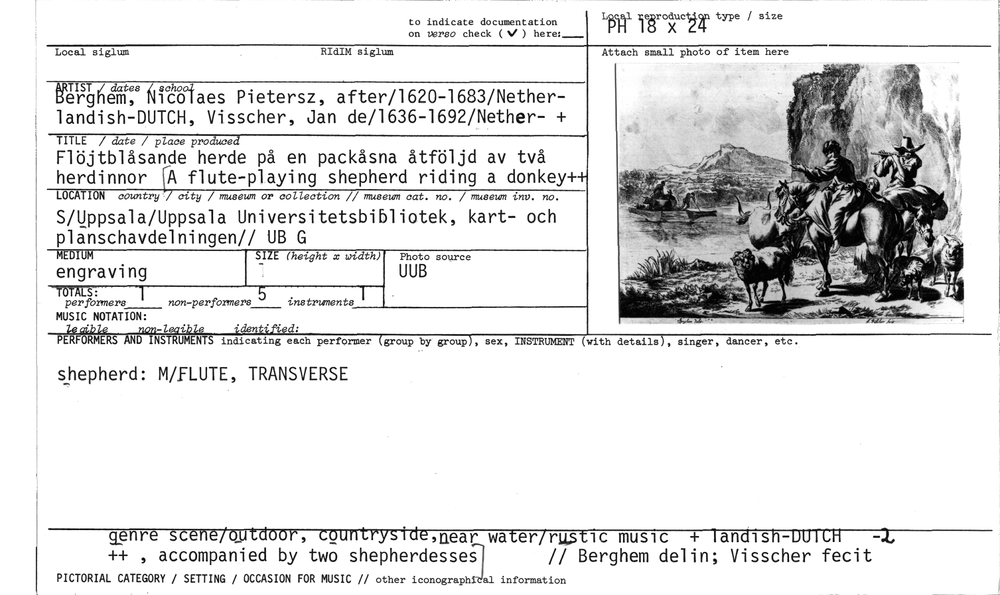 //// to indicate documentation //// on versa check (V ) here:___ //// type E"' //// Local siglum RIdIM siglum //// Attach small photo of item here //// Whge,841tBlaes Pietersz, after/1620-1683/Nether- //// landish-DUTCH, Visscher, Jan de/1636-1692/Nether- + //// TITLE / date / place produced //// Flöjtblåsande herde på en packåsna åtföljd av två herdinnor flute-playing shepherd riding a donkey++ //// LOCATION country 77 city / museum or collection // museum cat. no. / museum inv. no. //// S/Uppsala/Uppsala Universitetsbibliotek, kart- och planschavdelningen// UB G //// MEDIUM SIZE (height x width) //// engraving //// -MAB: //// perfbrmers non-performers 5 instruments //// 1 1 //// MUSIC NOTATION: //// leaible non-leaible identified, //// PERFORMERS AND INSTRUMENTS indicating each performer (group by group), sex, INSTRUMENT (with details), singer, dancer, etc. //// shepherd: M/FLUTE, TRANSVERSE //// genre scene out oor, coun rys] e,near water/rotic music + iandish-uum //// ++ , accompanied by two shepherdesses // Berghem delin; Visscher fecit //// PICTORIAL CATEGORY / SETTING / OCCASION FOR MUSIC // other iconograph al information //// Photo sonrce //// UUB ////