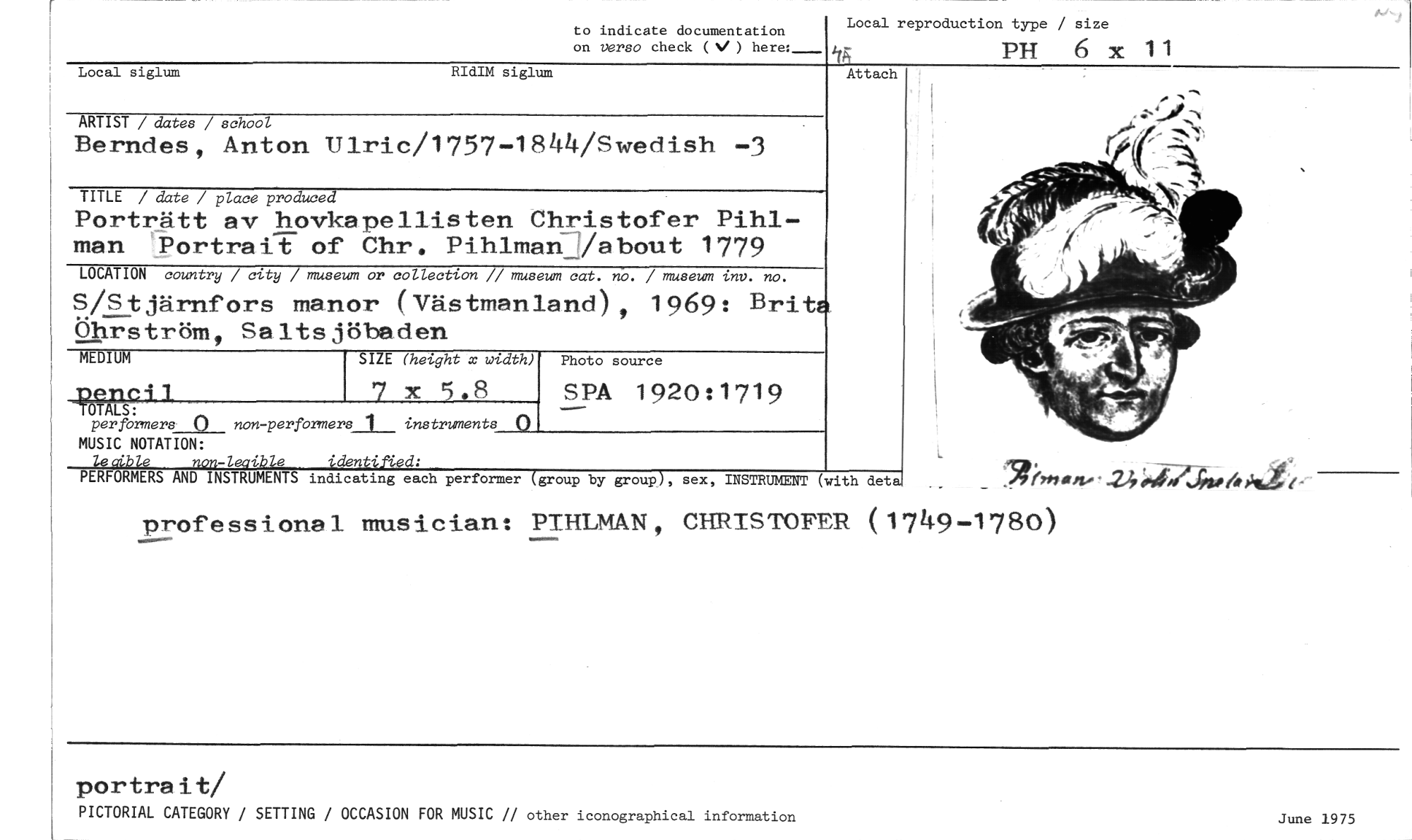 //// to indicate documentation Local reproduction type / size //// on verso check (V) here:_ PH 6 x 11 //// Attach //// ARTIST / dates / school //// Berndes , Anton lric/1757-1844/Swedish -3 //// TITLE / date / place produced //// Porträtt av hovka pe llis ten Chris tofer Pihl-man Portra i t of Chr . Pihlman 1/about 1779 //// LOCATION country / city / museum or collection // museum cat. no. / museum viv. no. //// S /S tjärnfors man //// öhrström , Sa lts j //// MEDIUM //// f$725751 //// per formers0 non-performers_t_ instruments 0 MUSIC NOTATION: //// le4ble non-leaible identified, //// PERFORMERS AND INSTRUMENTS indicating each performer //// profe ss iona 1 mus ician: PIHLMAN , CHRISTOFER ( 1749-1780) //// Local siglum RIdIM siglum //// or ( Västmanland) , 1969: Brita öbe den //// SIZE (height x width) //// 7 x 5.8 //// Photo source //// SPA 1920:1719 //// group by group), sex, INSTRUMENT (with deta //// -24iwUjrptilas,te - //// portres it/ //// PICTORIAL CATEGORY / SETTING / OCCASION FOR MUSIC // other iconographical information //// June 1975 ////