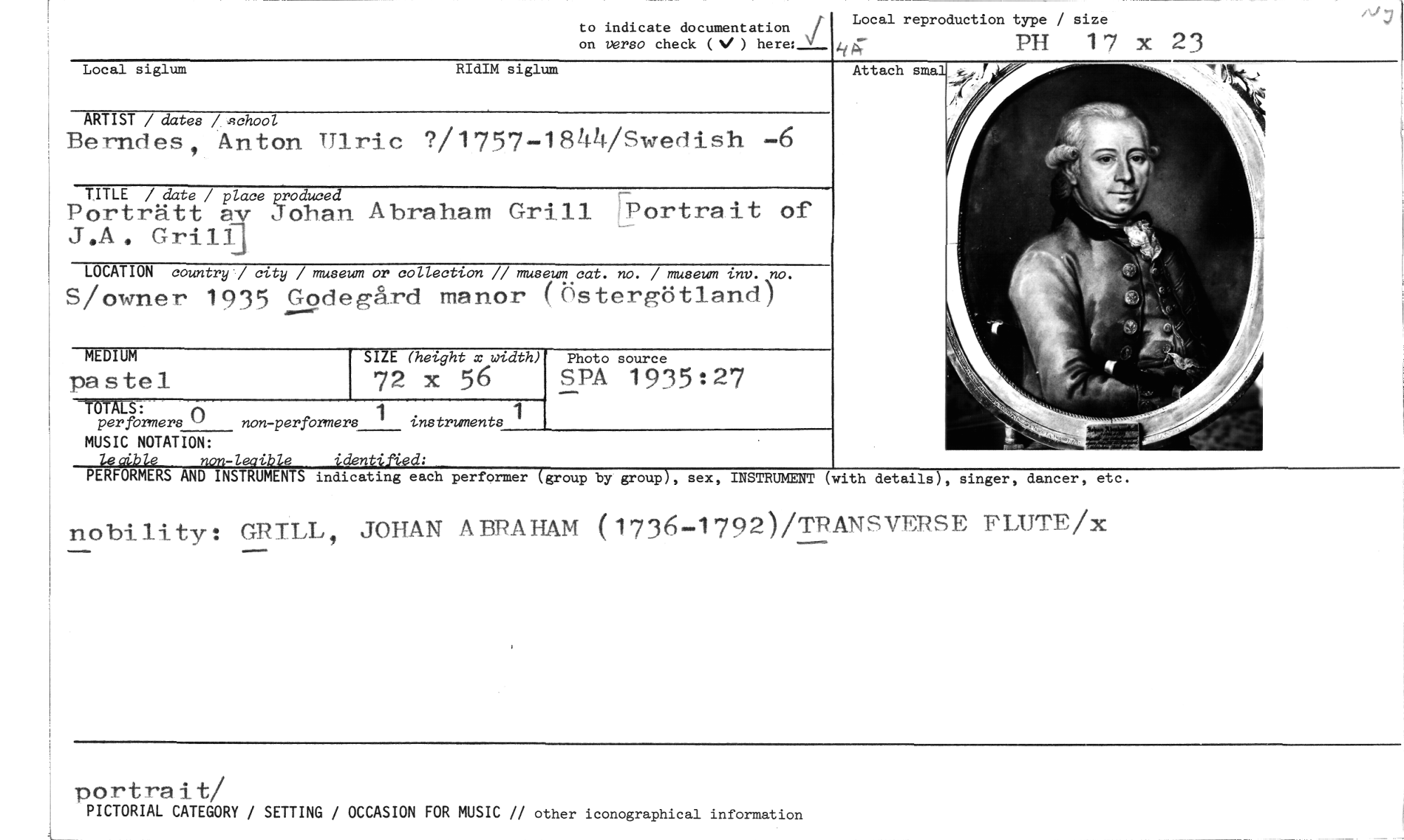 //// o.1 to indicate documentation //// verso check (V ) here. //// Local reproduction type / size //// 4A7 PH 17 x 23 //// Local siglum RIdIM siglum //// Attach s //// ARTIST / dates /. school //// Berndes, Anton Ulric ?/1757-1844/Swedish -6 //// TITLE / date / place produced //// Porträtt av Johan Abraham Grill .Portrait of J.A. //// LOCATION country•./ city / museum or collection // museum cat. no. / museum inv. no. //// S/owner 1935 Godegård manor (Östergötland) //// MEDIUM //// pastel //// SIZE (height x width) Photo source //// 72 x 56 SPA 1935:27 //// -'tis __ //// per formers non-perfbrmers instruments //// MUSIC NOTATION: //// t 'den //// PERFORMERS AND INSTRUMENTS indicating each performer group by group , sex, INSTRUMENT (with details), singer, dancer, etc. //// nobility: GRTLL, JOHAN ABRAHAM (1736-1792)/TRANSVERSE FLUTE/x //// portrait/ //// PICTORIAL CATEGORY / SETTING / OCCASION FOR MUSIC // other iconographical information ////