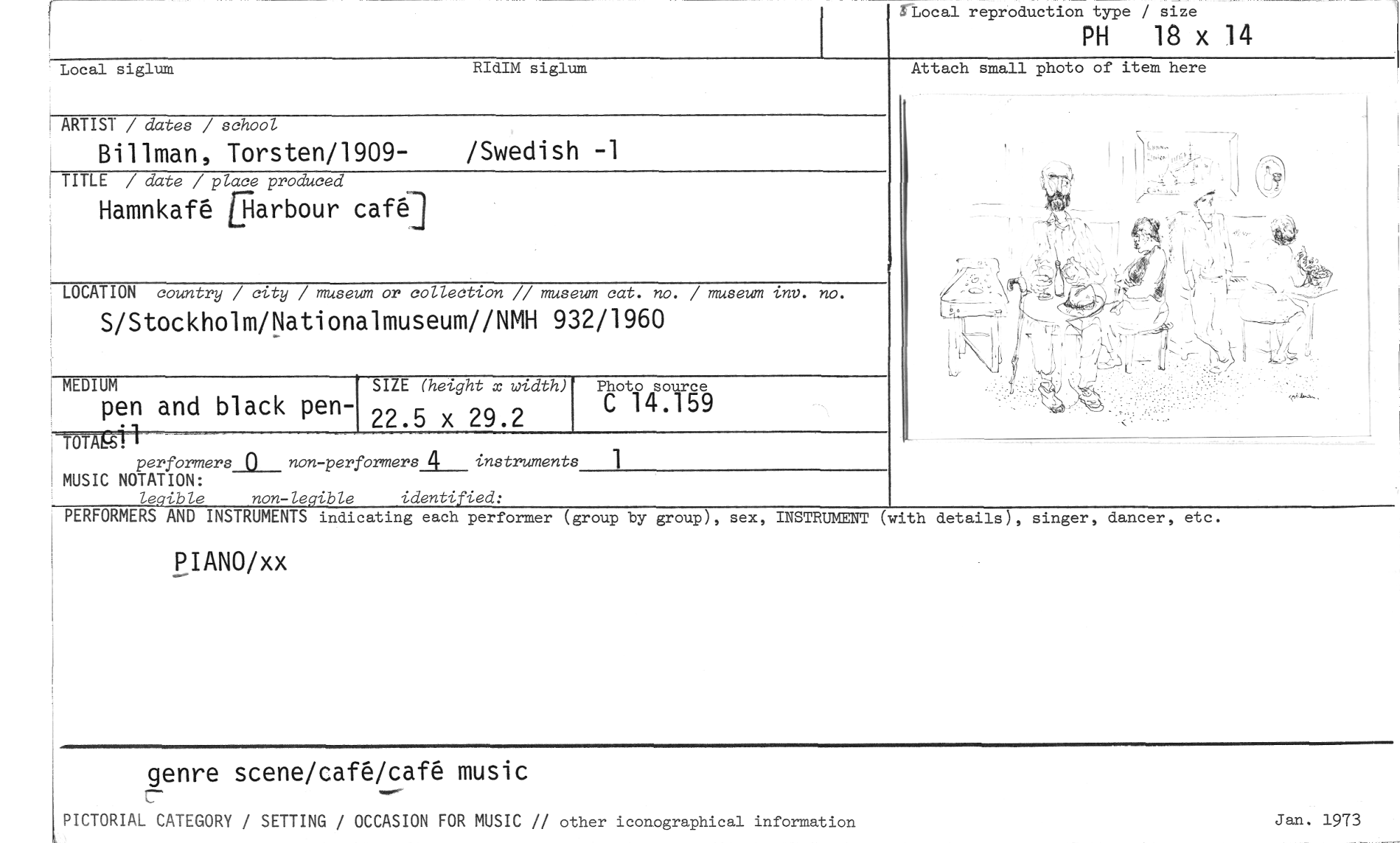 //// ILocal reproduction type / size //// PH 18 x 14 //// Attach small photo of item here //// cal siglum RIdIM siglum //// ARTIST / dates / school //// Billman, Torsten/1909- /Swedish -1 //// LOCATION country / city / museum or collection // museum cat. no. / museum inv. no. //// S/Stockholm/Nationalmuseum//NMH 932/1960 //// MEDIUM SIZE (height x width) //// pen and black pen- 22.5 x 29.2 //// performers_11__non-performersA___ instruments MUSIC NOTATION: //// legible non-legible identified: //// Photo source //// C 14.159 //// j TITLE / date / place produced Hamnkafé &iarbour cafq //// PERFORMERS AND INSTRUMENTS indicating each performer (group by group), sex, INSTRUMENT (with details), singer, dancer, etc. //// PIANO/xx //// genre scene/caM/ca-M music //// PICTORIAL CATEGORY / SETTING / OCCASION FOR MUSIC // other iconographical information //// Jan. 1973 ////