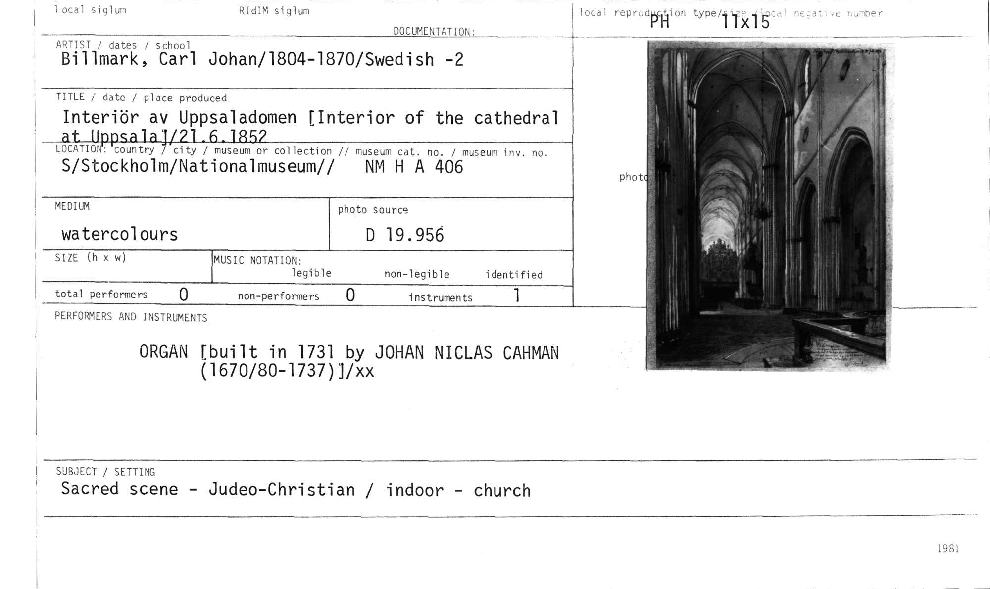 //// 1 otal siglum ,:IdIM siglum //// DOCUMENTATION. — //// ARTIST / dates / school //// Billmark, Carl Johan/1804-1870/Swedish -2 //// TITLE i date / place produced //// Interiör av Uppsaladomen [Interior of the cathedral //// at_Uppsalaj/71_6.1852 //// LOCP,TIC), country / city / museum or collection // museum=,. no. / museum inv. no. //// S/Stockholm/Nationalmuseumn NM H A 406 //// MEDIUM photo source //// watercolours D 19.956 //// SIZE (h x w) MUSIC NOTATION, //// legible non-legible identified //// total performers () non-performers O instruments 1 //// PERFORMERS AND INSTRUMENTS //// ORGAN [built in 1731 by JOHAN NICLAS CAHMAN (1670/80-1737)]/xx //// local reprodrffiion type/lui 5 .,! ne,au, number //// SUBJECT / SETTING //// Sacred scene - Judeo-Christian / indoor - church ////