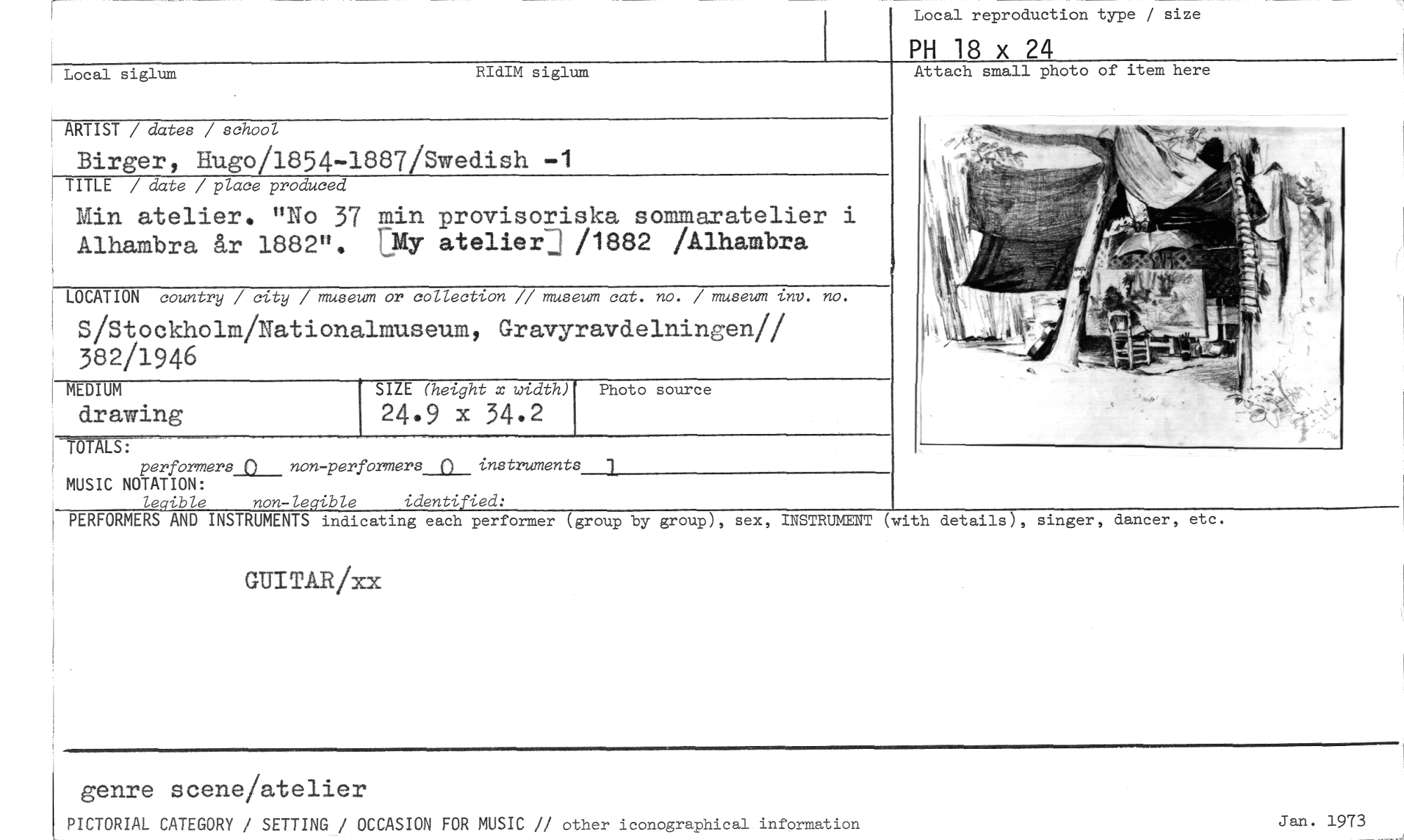 //// Local reproduction type / size //// PH 18 x 24 //// Local siglum RIdIM siglum //// ARTIST / dates / school //// Birger, Hugo/1854-1887/Swedish -1 //// TITLE / date / place produced //// Min atelier. "No 37 min provisoriska sommaratelier i Alhambra år 1882". EMy atelierj /1882 /Alhambra //// LOCATION country / city / museum or collection // museum cat. no. / museum inv. no. //// S/Stockholm/Nationalmuseum, Gravyravdelningen// 382/1946 //// MEDIUM 4 SIZE (height x width) Photo source //// drawing 24.9 x 34.2 //// //// TOtALST //// performers_p___ non-performers () instruments 1 MUSIC NOTATION: //// le ible non-le ible identi ied: //// PERFORMERS AND INSTRUMENTS indicating each performer (group by group //// Attach small photo of item here //// , inger, dancer, etc. //// , sex, INSTRUMENT (with details //// GUITAR/xx //// genre scene/atelier Jan. 1973 //// PICTORIAL CATEGORY / SETTING / OCCASION FOR MUSIC // other iconographical information //// ////