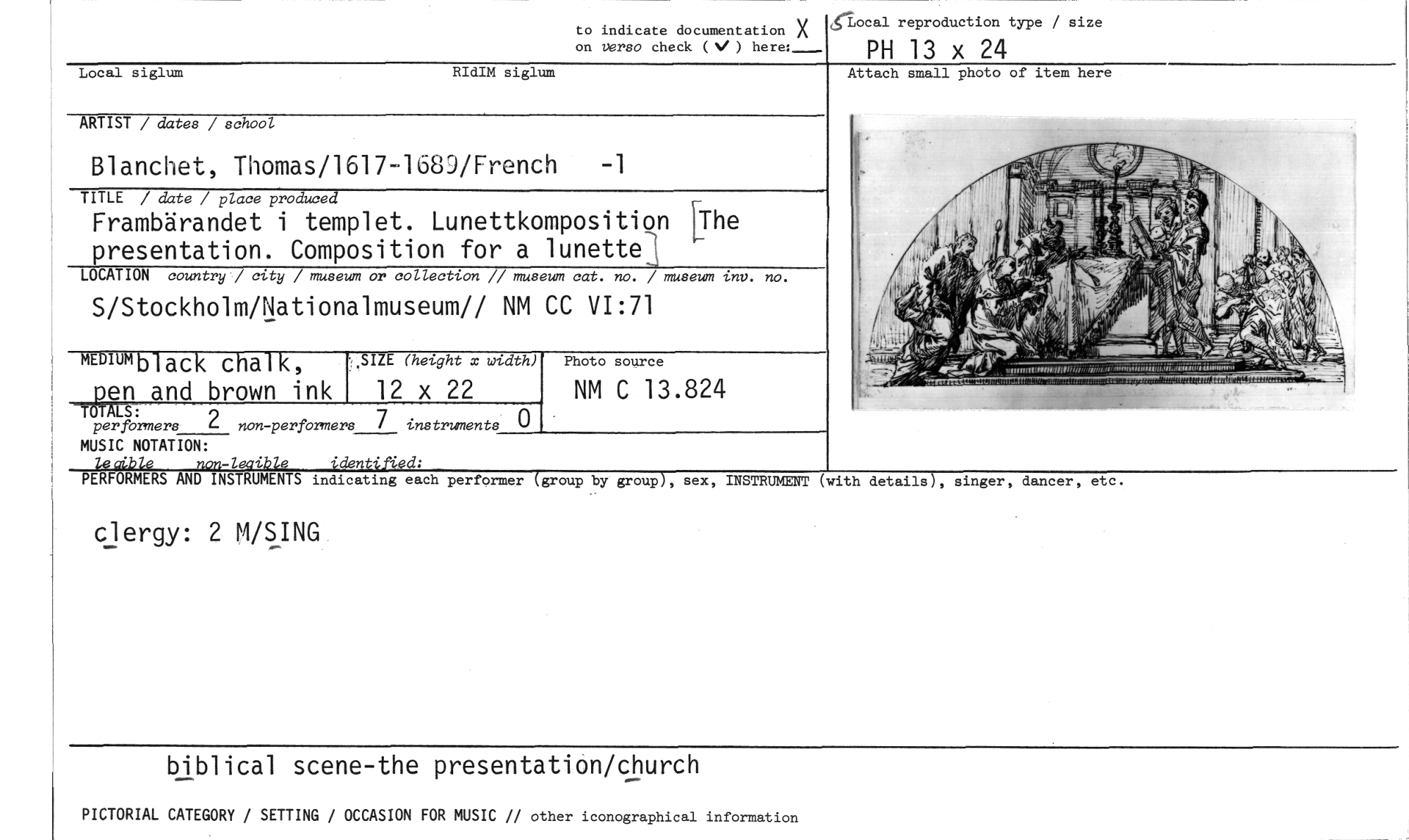 //// to indicate documentation X on verso check ( ) here:_ //// ,‹Local reproduction type / size //// PH 13 x 24 //// Local siglum RIdIM siglum //// ARTIST / dates / school Attach small photo of item here //// Blanchet, Thomas/1617-168/Trench -1 //// TITLE / date / place produced //// Frambärandet i templet. Lunettkomposition EThe //// presentation. Composition for a lunette3 //// LOCATION country / city / museum or collection // museum cat. no. / museum inv. no. //// S/Stockholm/Nationalmuseum// NM CC VI:71 //// MEDIUM black chalk, //// perfbrmers 2 non-performers 7 instruments 0 MUSIC NOTATION: //// identifka: PERFORMERS AND INSTRUMENTS indicating each performer (group by group), sex, INSTRUMENT (with details), singer, dancer, etc. //// clergy: 2 M/SING //// _Töprr and brown ink //// •,SIZE (height x width) //// 12 x 22 //// Photo source //// NM C 13.824 //// biblical scene-the presentation/church //// PICTORIAL CATEGORY / SETTING / OCCASION FOR MUSIC // other iconographical information ////